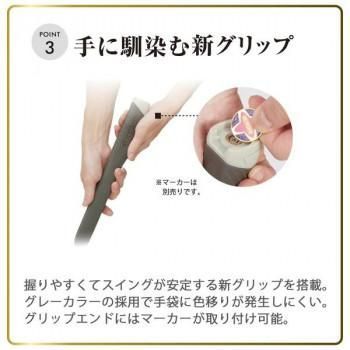硬さ約1.6倍の硬質フェイス。転がり性能約13%向上した硬質グレードのデュラフェイス、スイングした力をしっかり伝える。手に馴染む太さでスイングが安定するグリップを搭載、グリップエンドにマーカーの取り付けが可能。