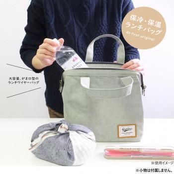 杢調生地で落ち着いたカラーのがま口型の保冷・保温のランチバッグLサイズです。開き口はワイヤーが入っていて大きく開くので、お弁当の出し入れがしやすくて便利です。ペットボトルを縦に入れられるので、お弁当と一緒に水筒の飲み物など持ち運べます。保冷剤などが入る内ポケット付きです。