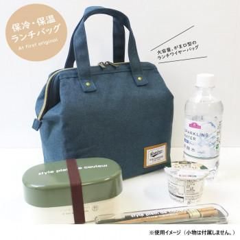 杢調生地で落ち着いたカラーのがま口型の保冷・保温のランチバッグLサイズです。開き口はワイヤーが入っていて大きく開くので、お弁当の出し入れがしやすくて便利です。ペットボトルを縦に入れられるので、お弁当と一緒に水筒の飲み物など持ち運べます。保冷剤などが入る内ポケット付きです。