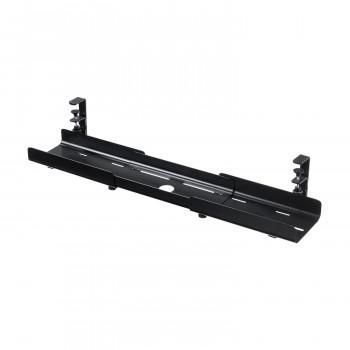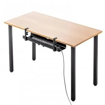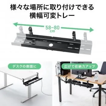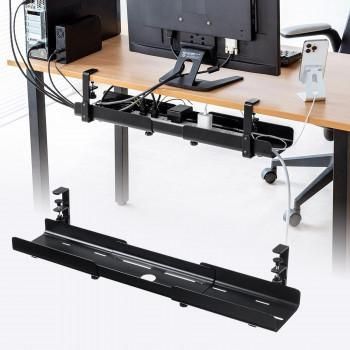 スチールタイプで、幅580~最大804mmまで可変できるケーブル配線トレーです。デスク下に横方向、縦方向どちらにも取り付けが可能で、自由にタップやケーブルを設置し配線ができます。取り付けは汎用クランプでデスクに締め付けて取り付けます。天板厚さ10mm~33mmに対応しています。※バックパネル、配線口、パーティションなどで取り付けられない場合もあります。タップなどを仮固定できる、面ファスナー4本付きです。
