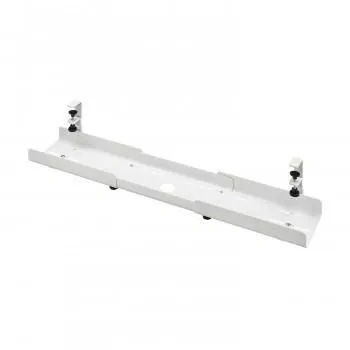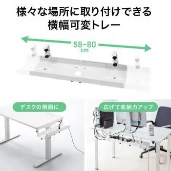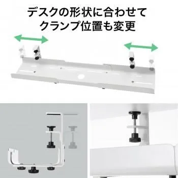 デスク下に横方向、縦方向どちらにも取り付けが可能で、自由にタップやケーブルを設置し配線ができます。取り付けは汎用クランプでデスクに締め付けて取り付けます。天板厚さ10mm~33mmに対応しています。※バックパネル、配線口、パーティションなどで取り付けられない場合もあります。タップなどを仮固定できる、面ファスナー4本付きです。