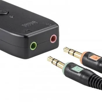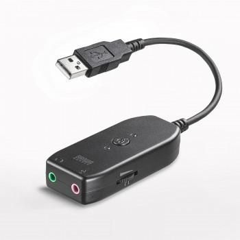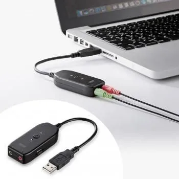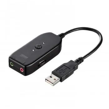 3.5mmプラグのヘッドホンやマイクをUSBに接続できる変換アダプタです。サウンドカードやドライバーは不要。USBポートに差し込むだけの簡単接続です。パソコン内部のノイズの影響を受けにくくクリアな高音質を実現します。マイク端子がないパソコンでも、すでにヘッドホン端子が埋まっているパソコンでも使用できます。マイクミュートやボリュームコントロール付きです。