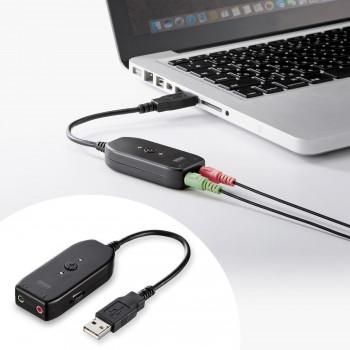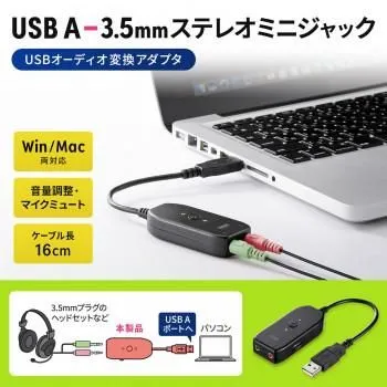 ■ラッピング(包装)対応不可です。 3.5mmプラグのヘッドホンやマイクをUSBに接続できる変換アダプタです。サウンドカードやドライバーは不要。USBポートに差し込むだけの簡単接続です。パソコン内部のノイズの影響を受けにくくクリアな高音質を実現します。マイク端子がないパソコンでも、すでにヘッドホン端子が埋まっているパソコンでも使用できます。マイクミュートやボリュームコントロール付きです。 対応機種:Windows搭載(DOS/V)パソコン、Apple Macシリーズ、Chrome OS搭載パソコン ※標準でUSBポート(Aコネクタ)を持つ機種。