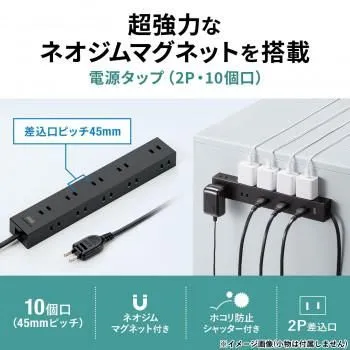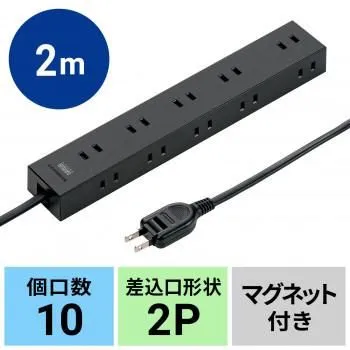 商品名:サンワサプライ 電源タップ 2P 10個口 強力ネオジムマグネット シャッター付 2m ブラック TAP-2210-2BK