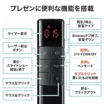 プレゼンに最適で、約100m先までの照射が可能な赤色光レーザーを搭載しています。パワーポイントで動作するソフトウェアレーザー機能が使え、オンラインプレゼンにも最適です。ジャイロセンサー搭載で、本体の向きを変えるだけで簡単にマウス操作ができます。パワーポイントのページ送り、戻し、スライドショー開始、終了など基本的な操作が可能です。プレゼンの時間配分を効率的に行える振動機能付きタイマーを搭載しています。