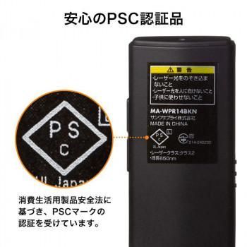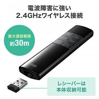 ■ラッピング(包装)対応不可です。 プレゼンに最適で、約100m先までの照射が可能な赤色光レーザーを搭載しています。パワーポイントで動作するソフトウェアレーザー機能が使え、オンラインプレゼンにも最適です。ジャイロセンサー搭載で、本体の向きを変えるだけで簡単にマウス操作ができます。パワーポイントのページ送り、戻し、スライドショー開始、終了など基本的な操作が可能です。プレゼンの時間配分を効率的に行える振動機能付きタイマーを搭載しています。 電波障害に強い2.4GHzワイヤレスを使用しているので、歩きながらのプレゼンにも対応できます。 会社での会議など、多人数の使用でも安心の抗菌仕様です。 レシーバー本体収納、音量調節機能、ペン・消しゴム機能付きです。 消費生活用製品安全法に基づき、PSCマークの認証を受けています。