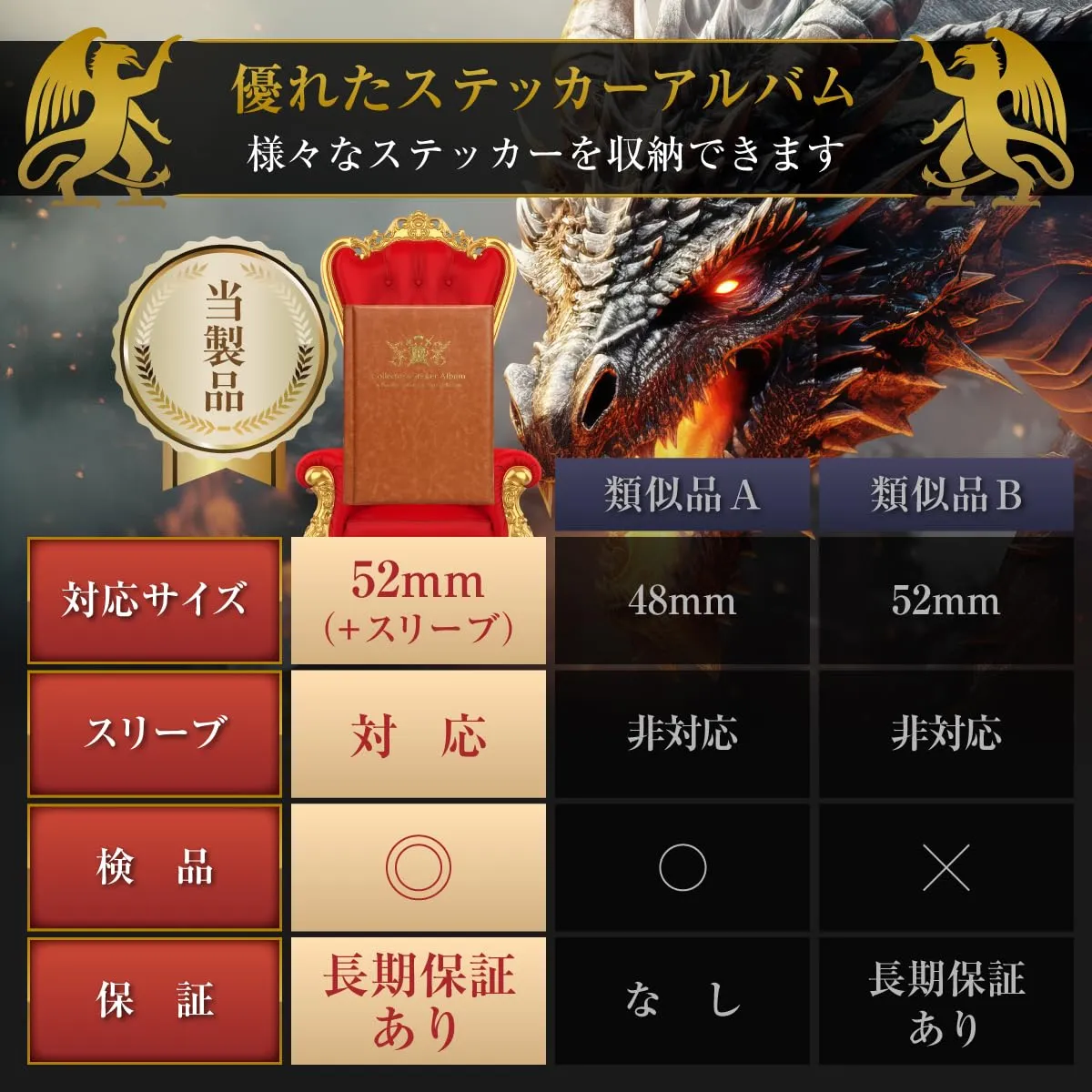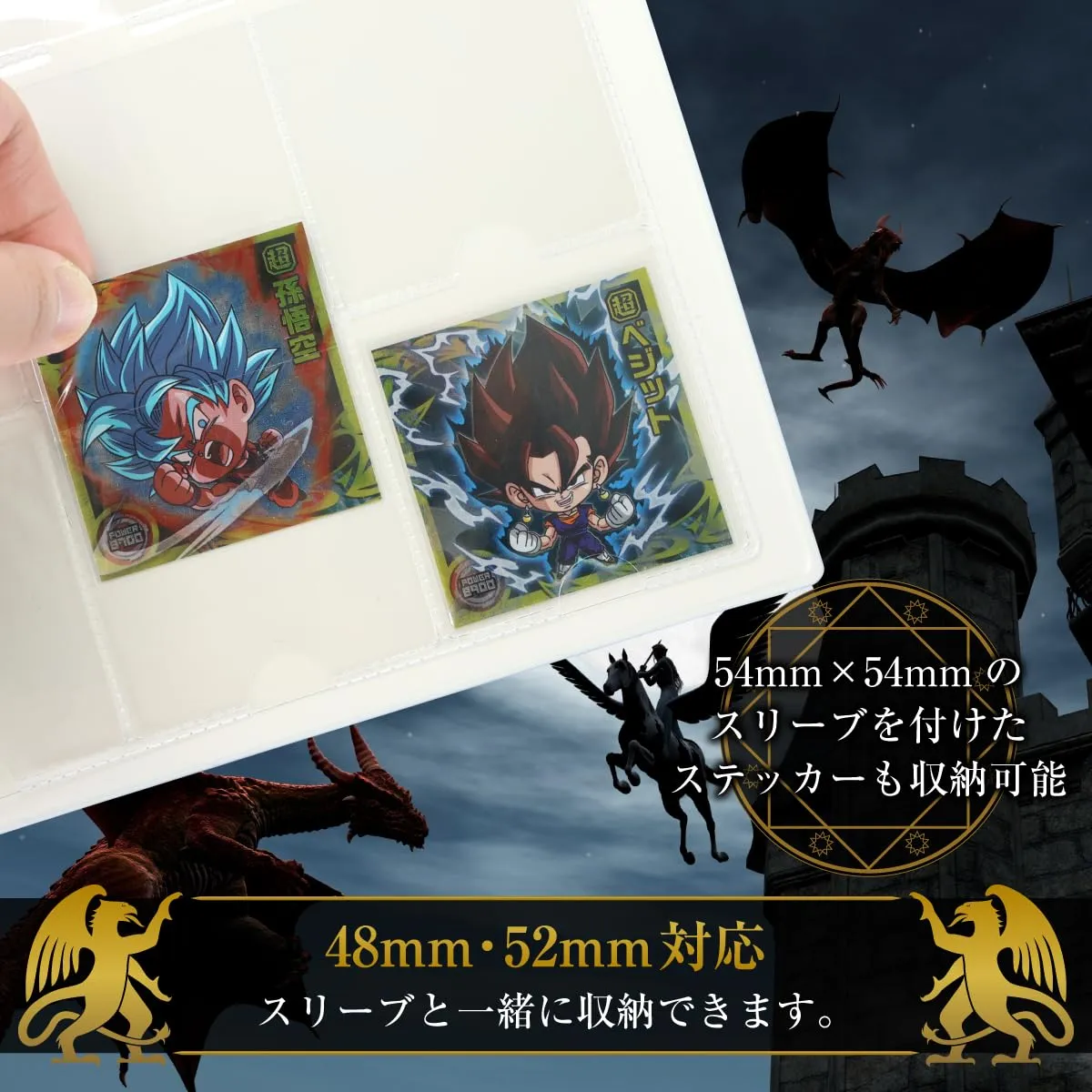 【カラー】ブラック・ブラウン ※お好みのカラーをお選びただけます。☑️※当商品は"メイクスマイル岩手"のオリジナル商品となります。類似商品を出品されるショップ様がおりますが、当商品とは仕様が異なりますのでご注意ください。また、他者様の当カタログでの販売はお控え下さい。 このビックリマンチョコ・シールウエハース等ファイルは、アニメファンから大人までお使いいただける大容量のポケット式アルバムです。レザー調の高級感溢れる表紙は、収集したチョコシールを自慢したくなるデザインに仕上げています。最大480枚ものシールを収納可能で、傷や汚れから守り、紛失防止やスペース削減に繋がります。ポケットはクリアカラーで、鮮明に見えるようになっています。本体サイズは26.5cm×19.7cm、ポケットサイズは57mm×57mmで、48mm・52mmのシールに対応しています。額縁なしで、スタンプアルバムとして使用できます。