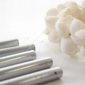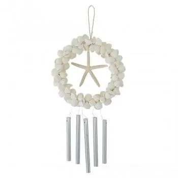 シェルとスターフィッシュのリースの下で心地よい音で揺れるチャイム。風通しの良い場所に飾って音をお楽しみください。