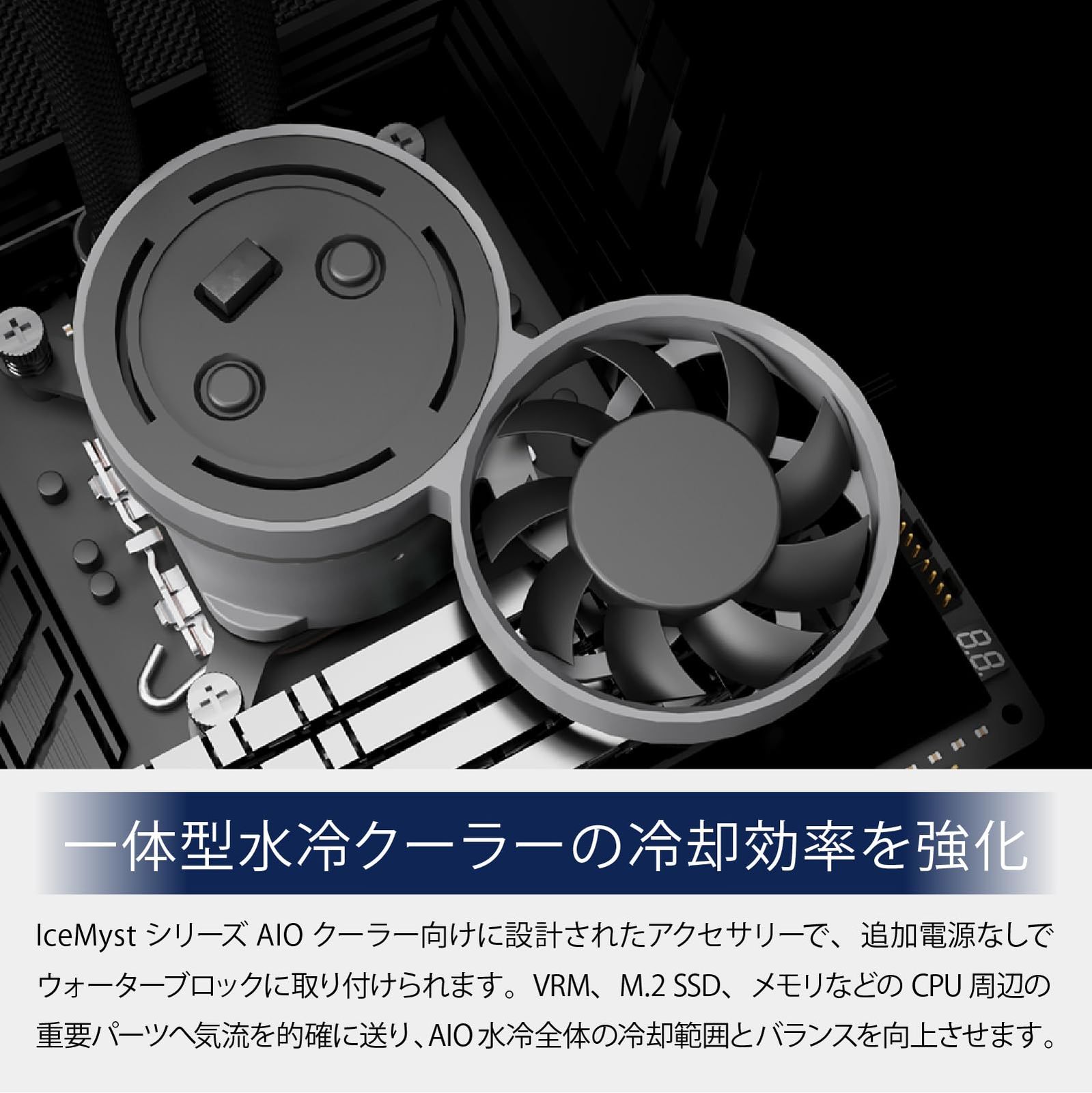 IceMyst およびHailstone シリーズの AIO クーラーポンプブロックに直接取り付け可能