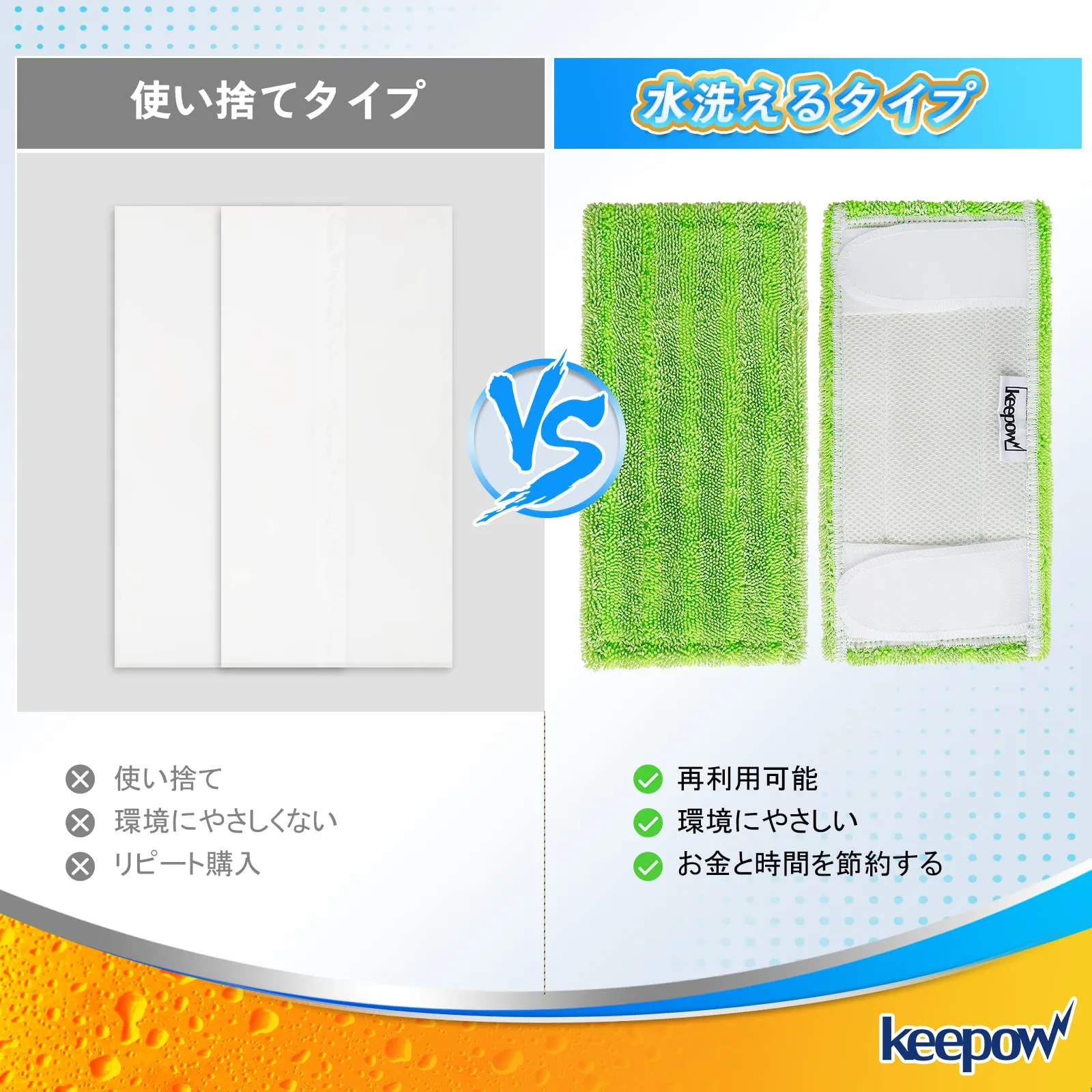 【再利用可能】フロアワイパーモップパッドは便利な着脱式クロスで取り替えできます。モップが水で丸洗いは可能なので、繰り返し利用できて、使い捨てタイプより良いコスパがあて、環境にも優しいです。