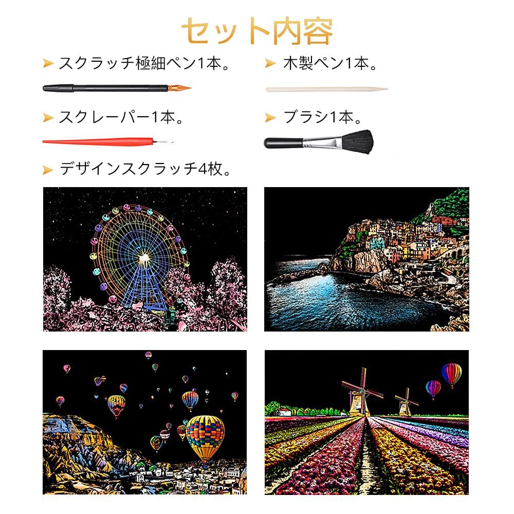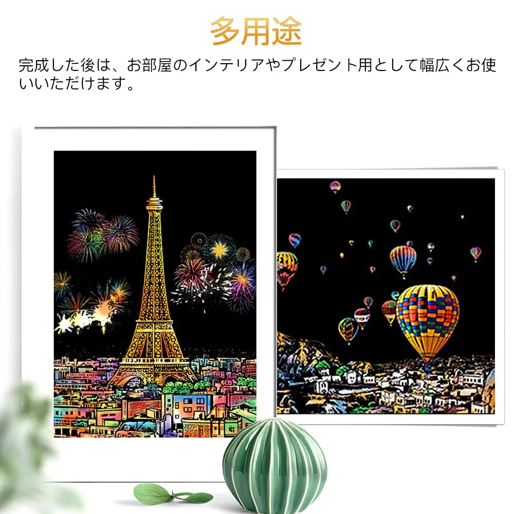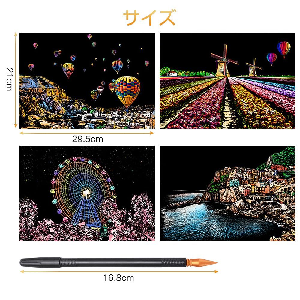 新品 LIANHATA スクラッチアート 4枚入 スクラッチ極細ペン付き 21*29cm A4サイズ スクラッチペーパー レインボー絵 夜景 花火 観覧車 花畑 彫刻アート DIY 削るだけで美しいアート 部屋飾り (ヨーロッパ風景)