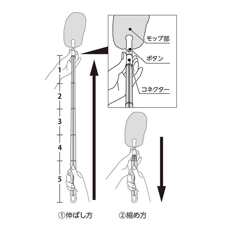 【柄の長さの調節方法】柄は5段階伸ばすことができます。 1.伸ばし方 コネクターと柄を持って上図①の矢印の方向に引き伸ばします。 2.縮め方 コネクターと柄を持って右図②の矢印の方向に動かして縮めます。 ※ヘッドの破損や脱落の原因になるため、長さ調節の際はモップ部やボタンを持たないでください。 ※柄を伸縮させる際は、指等を挟まないようにご注意ください。 ※ヘッドを外した状態で伸縮させる場合も同様の方法で行なってください。 ・おそうじ指示棒伸縮の柄は、構造上、柄内部の部品同士の摩擦を大きくしています。 このため、特にお使い当初は柄の伸縮にある程度の強い力が必要となりますが、生産上の不具合ではございません。
