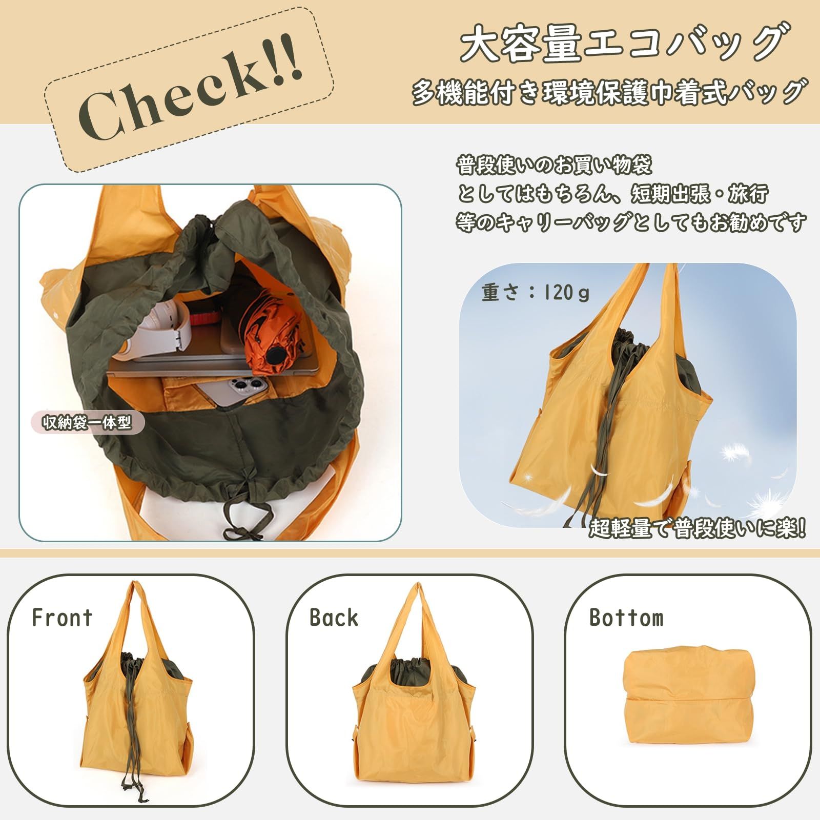 【軽量&折りたたみ式】:エコバッグの重量は120gで、超軽量で普段使いに楽です。使わない時に折りたたんだ状態で服のポケット/バッグに直接入れるコンパクトサイズになり、持ち運びにも便利です。荷物を取り出してからまた折りたたむことができるので、省スペースで収納しやすいです。実用的かつ使い勝手なエコバッグです。