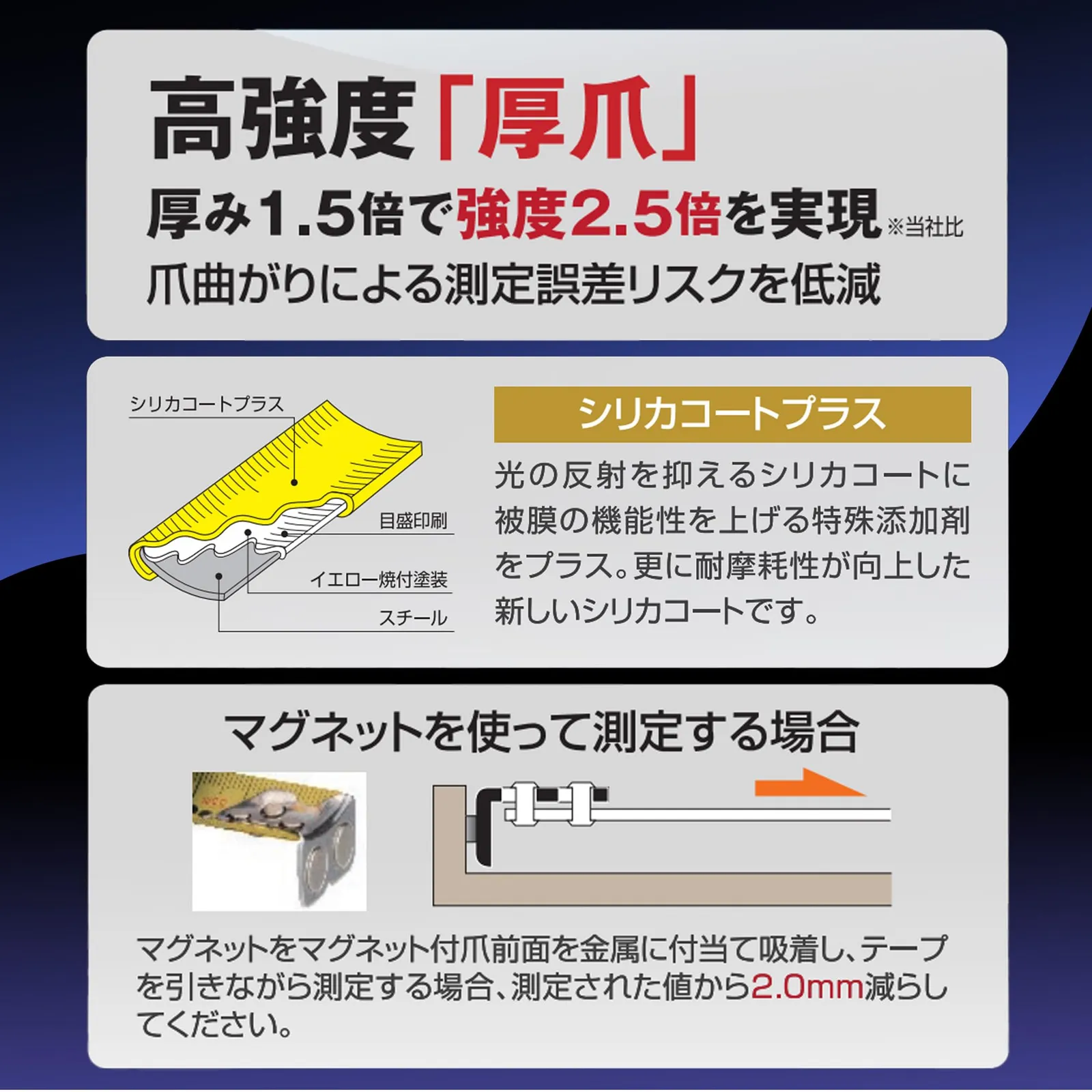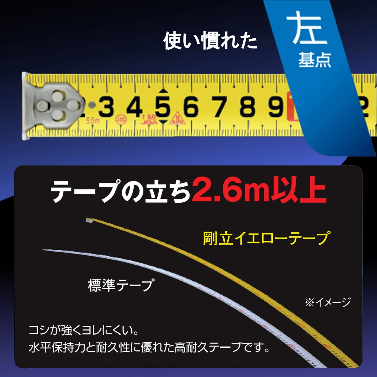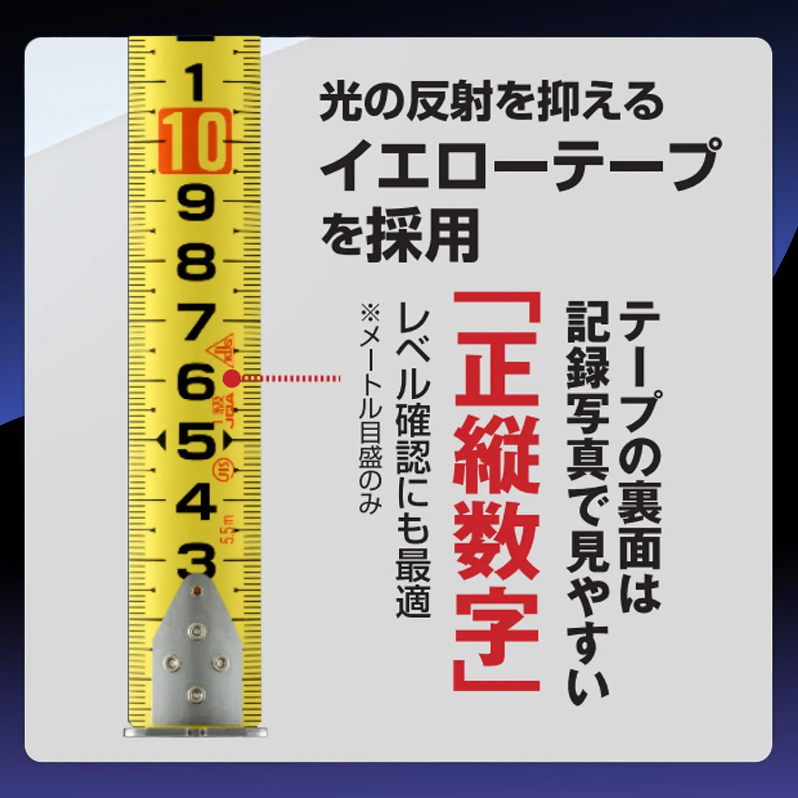 【特長】 握りやすい従来の5m仕様サイズのコンパクトボディのまま5.5mを実現。使い慣れた左基点。 様々なコンベックス対応のメタルホルダー(MH-01GZ)を付属。 全く新しいメタルホルダーGZ対応で、テープ立ち2.6m以上。 コシが強くヨレにくい剛立イエローテープなので、水平保持力と耐久性に優れた高耐久テープ。 テープの裏面は記録写真で見やすい正縦数字なので、レベル確認にも最適。 光の反射を抑えるシリカコートに被膜の機能性を上げる特殊添加剤をプラス。更に耐摩耗性が向上した新しいシリカコート。 高強度の厚爪。厚み1.5倍で強度2.5倍を実現。爪曲がりによる測定誤差リスクを低減。
