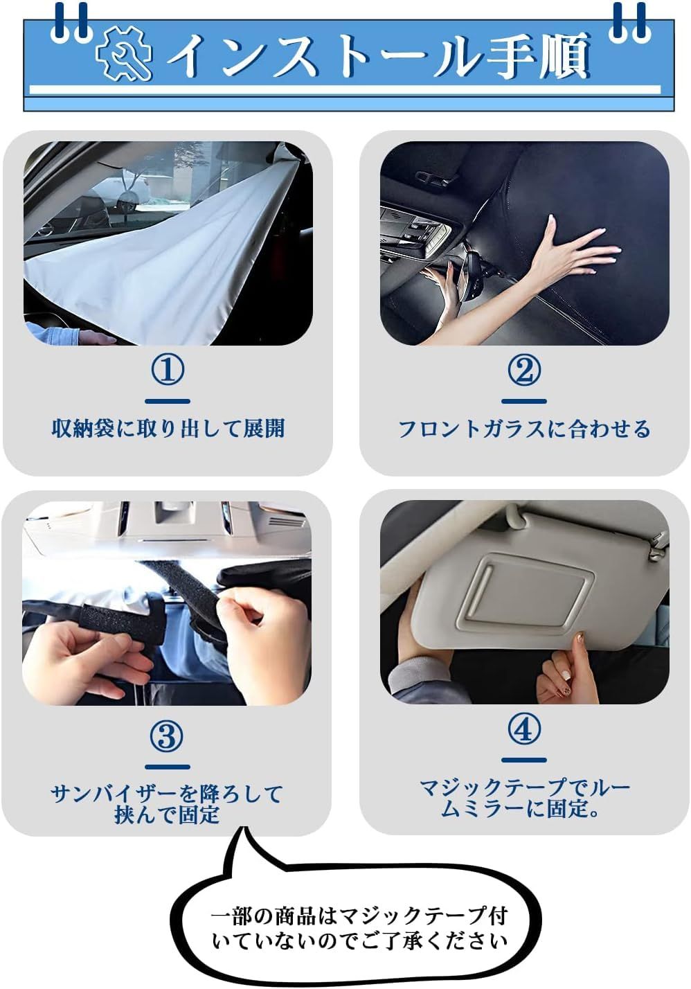 【取付簡単】ワンタッチで開き、初心者でも、席に座ってままでも③STEPでらくらくセットアップできるサンシェードです。まず同梱の専用収納袋を開け、サンシェードを取り出します。自動的に展開するサンシェードをフロントガラスに沿ってはめ込み、車サンバイザーで挟むのみです。収納の場合も手間がかかりません。製品は形状記憶合金を使用して、折り畳んで迅速に収納できます。小さく畳んで、ドアポケットに収納でき、非常に使えやすいサンシェードです。 ??