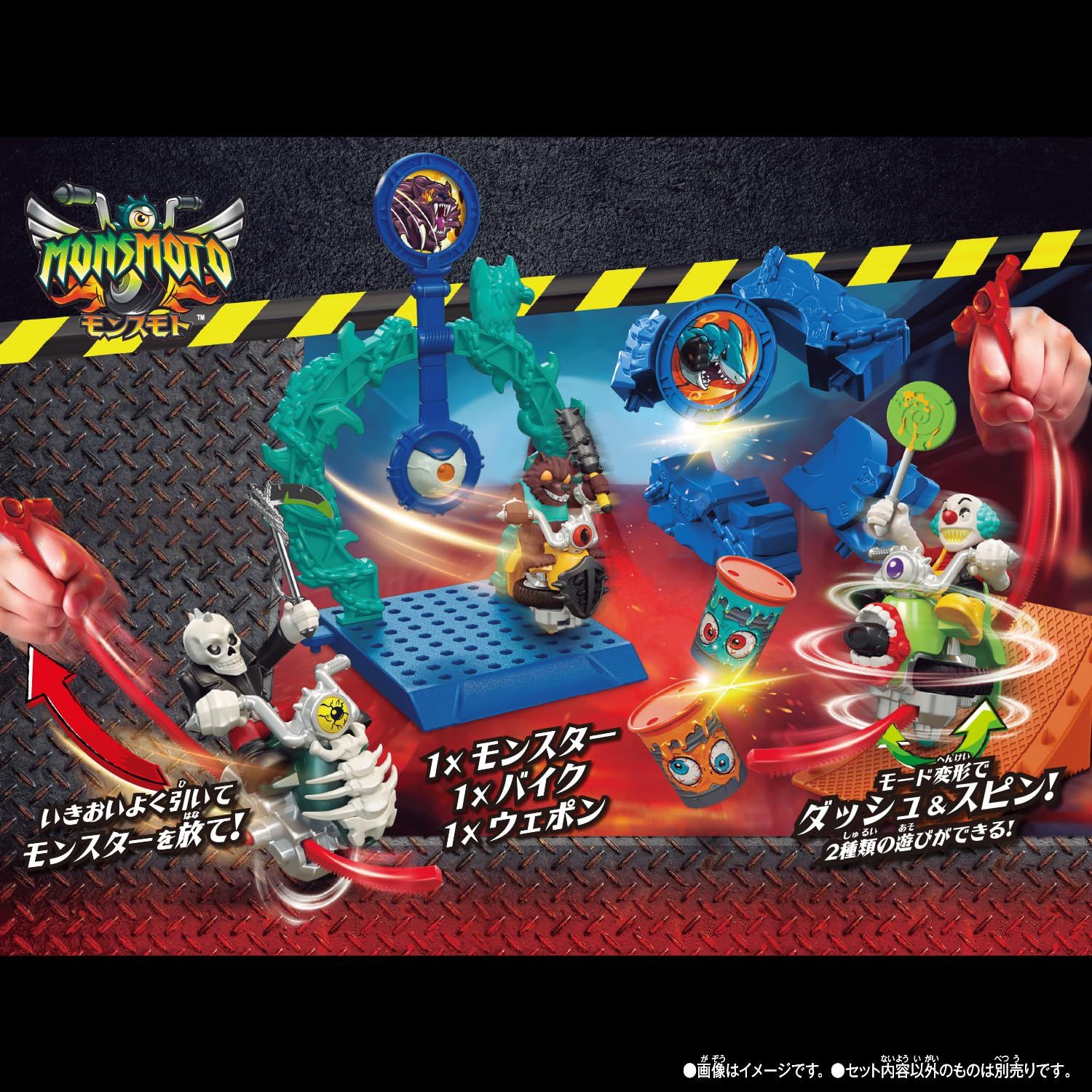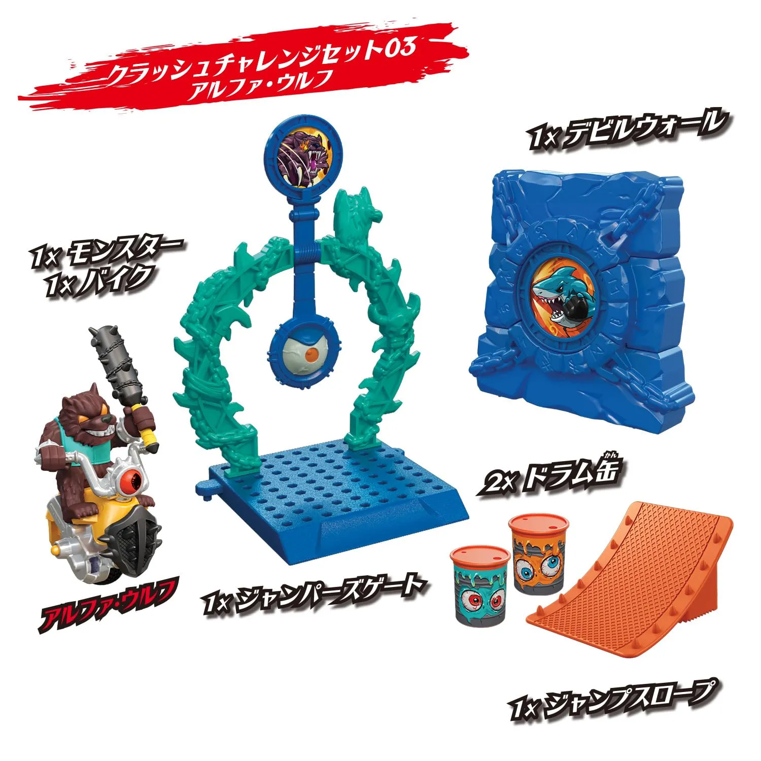 ダッシュ&クラッシュ遊びが楽しめるモンスター(アルファ・ウルフ)と4種類のプレイセットの入ったセットです。