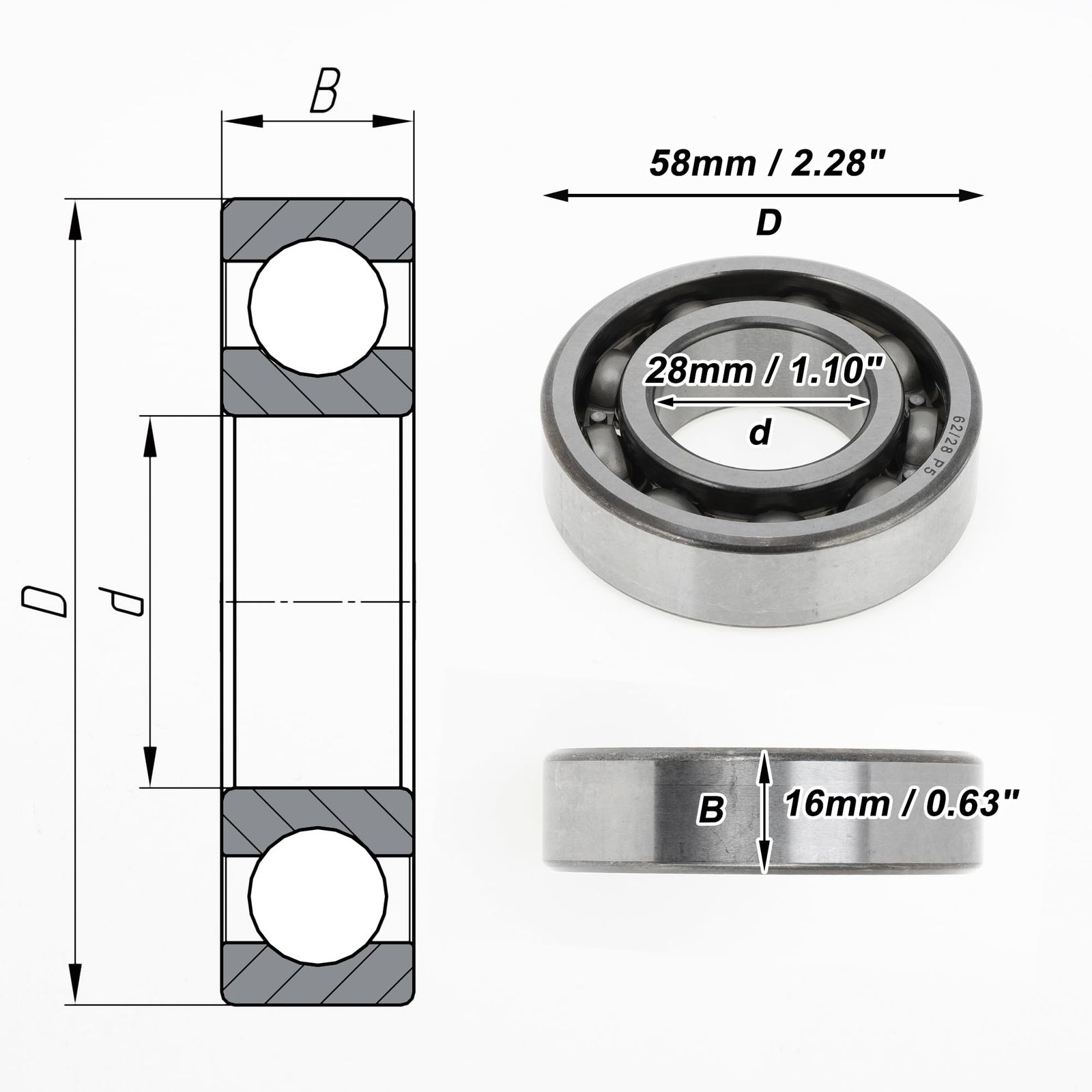 仕様:外径: 58mm / 2.28インチ、内径: 28mm / 1.10インチ、幅: 16mm / 0.63インチ、タイプ: 62/28、精度レベル: P5、基本荷重評価 (kN): Cr:16.6 C0r:9.5、限界速度(min-1): グリース:12000 オイル:14000