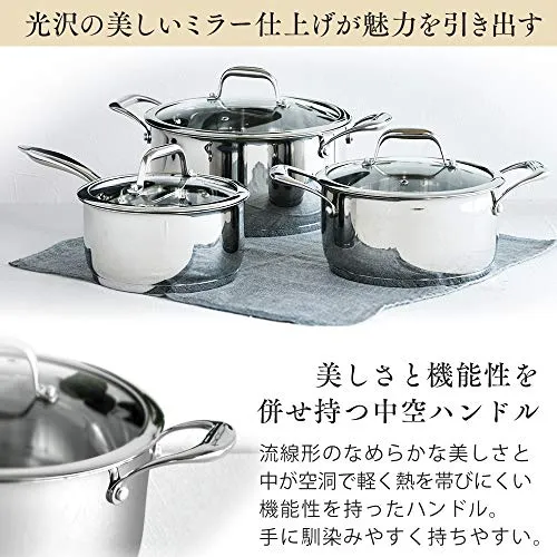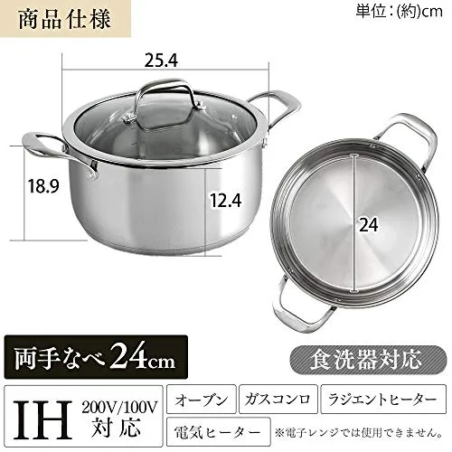 材質:本体:ステンレス鋼(クロム18%、ニッケル8%)、取手:ステンレス鋼(クロム16%、ニッケル6%)、はり底:アルミニウム合金、ステンレス鋼(クロム16%)