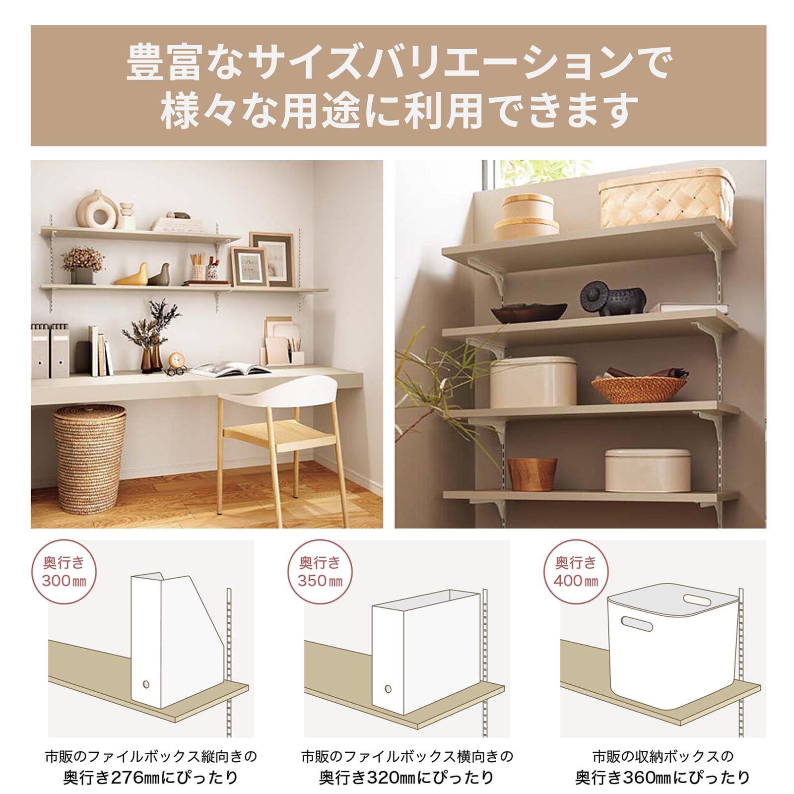【豊富なサイズ展開】 奥行145mm 文庫本や小物・植物など装飾品 奥行250mm カゴ・タオル置きにちょうどいいサイズ 奥行300mm 絵本や雑誌・小物・靴などにも良いサイズ 奥行350mm バスタオルや洗面用品など 奥行400mm お鍋やフライパンも余裕で収納できる 奥行450mm 大きな箱などもゆとりをもって収納、たたんだ服など 奥行600mm 大きな奥行きのある棚、パネル用に縦使いの用途も