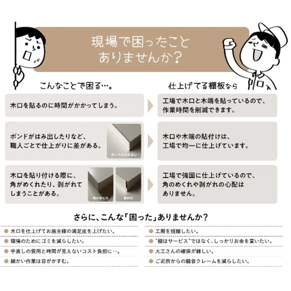 【現場で困ったことありませんか】 ・木口を貼るのに時間がかかってしまう。 ・ボンドがはみ出したり職人ごとで仕上がりに差がある。 ・木口を貼り付ける際に、角が捲れたり剥がれしまうことがある。 ・工期を短縮したい。