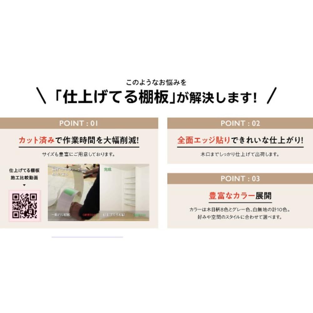 【このような悩みを\「仕上げてる棚板」が解決します!/】 POINT1:間口の広いパントリーやクローゼットに仕切りなしで横幅いっぱいに収納できます。 POINT2:カット済で作業時間を大幅削減!サイズも豊富にご用意しております。 POINT3:全面エッジ貼りできれいな仕上がり!木口までしっかり仕上げて出荷します。