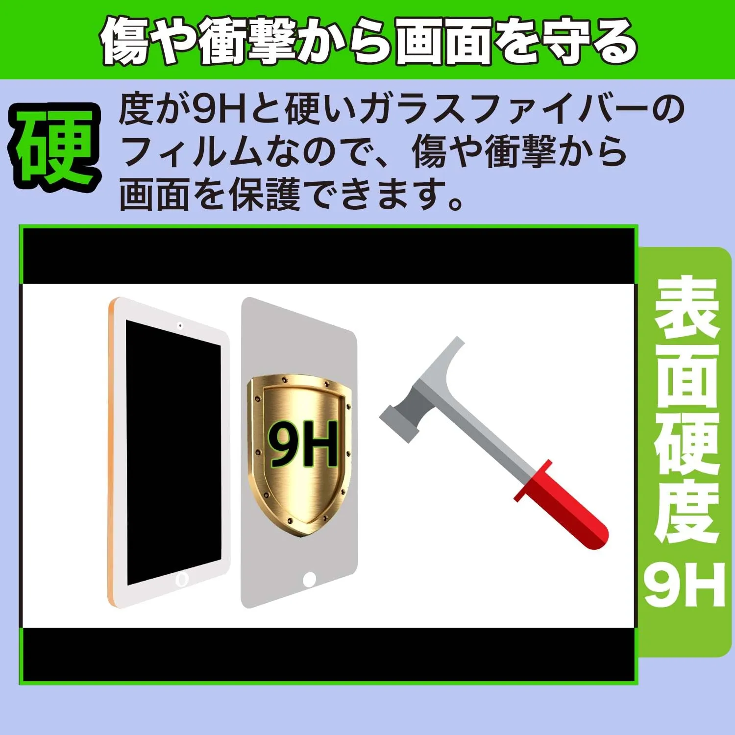 【1】硬度9Hのガラスファイバーと非常に強いので、画面を摩損、傷、落下などの破損、衝突から守ります。