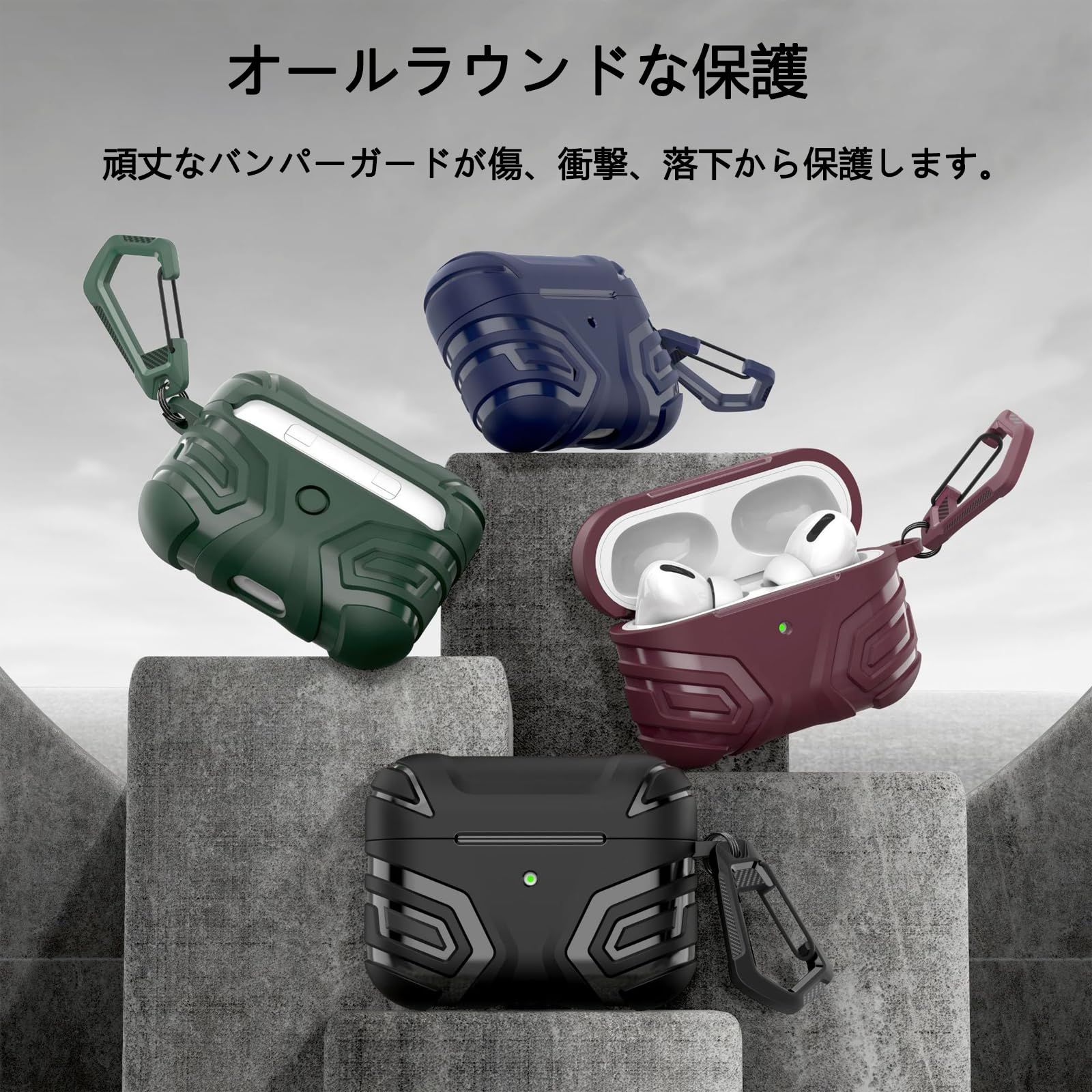 4つの衝撃吸収構造で全面保護: 4つの衝撃吸収構造によってAirPods Proを保護します。ソフト素材とハード素材の組み合わせたデュアルストラクチャーを採用し、衝撃を吸収します。コーナークッションは落下時にダメージが大きい角部分の衝撃を吸収します。衝撃吸収力が高いため、破損や傷つきが心配な方に最適なケースです。
