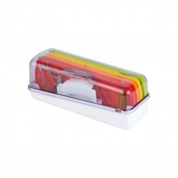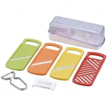 野菜調理のバリエーションアップ。キュウリやにんじん、大根等のスライス、千切り、おろし、つま切りが手軽にできます。スッキリ片付く収納ケースの蓋を受け皿として使えます。安全ホルダー付き。