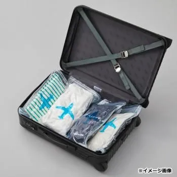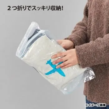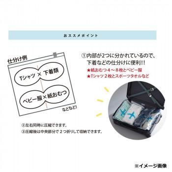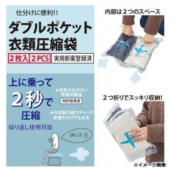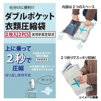 内部が二つに分かれている為、衣類の仕分けに便利な新タイプの圧縮袋です。圧縮後は中央部分で2つ折りしてスッキリ収納できます!下着などの仕分けに便利!!衣類を1泊目と2泊目に分けたり、Tシャツと下着を分ける等、使い方は様々。左右同時に圧縮します。上に乗って約2秒で圧縮!空気が抜けやすい特殊弁構造、左右同時に圧縮可能です。