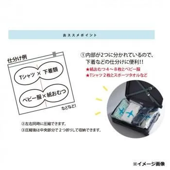 ■ラッピング(包装)対応不可です。 内部が二つに分かれている為、衣類の仕分けに便利な新タイプの圧縮袋です。圧縮後は中央部分で2つ折りしてスッキリ収納できます!下着などの仕分けに便利!!衣類を1泊目と2泊目に分けたり、Tシャツと下着を分ける等、使い方は様々。左右同時に圧縮します。上に乗って約2秒で圧縮!空気が抜けやすい特殊弁構造、左右同時に圧縮可能です。 ※製品は用途に適したご使用方法にて正しくお使いください。誤った使用は破損の原因となります。 サイズ約縦39(スライダー含む)×横40cm 個装サイズ:25×14×3cm 重量約30g 個装重量:60g 素材・材質ナイロン、ポリエチレンフィルム スライダー:ポリプロピレン 仕様スライダー付き セット内容2枚入り 生産国日本 fk094igrjs おすすめ 商品番号:ab-1825298 ※代引き不可 同梱不可※北海道、沖縄、離島送料は別途お見積り。※手配完了後は、ご注文キャンセルを承る事が出来ません。何かございましたら事前にお問い合わせ下さい。