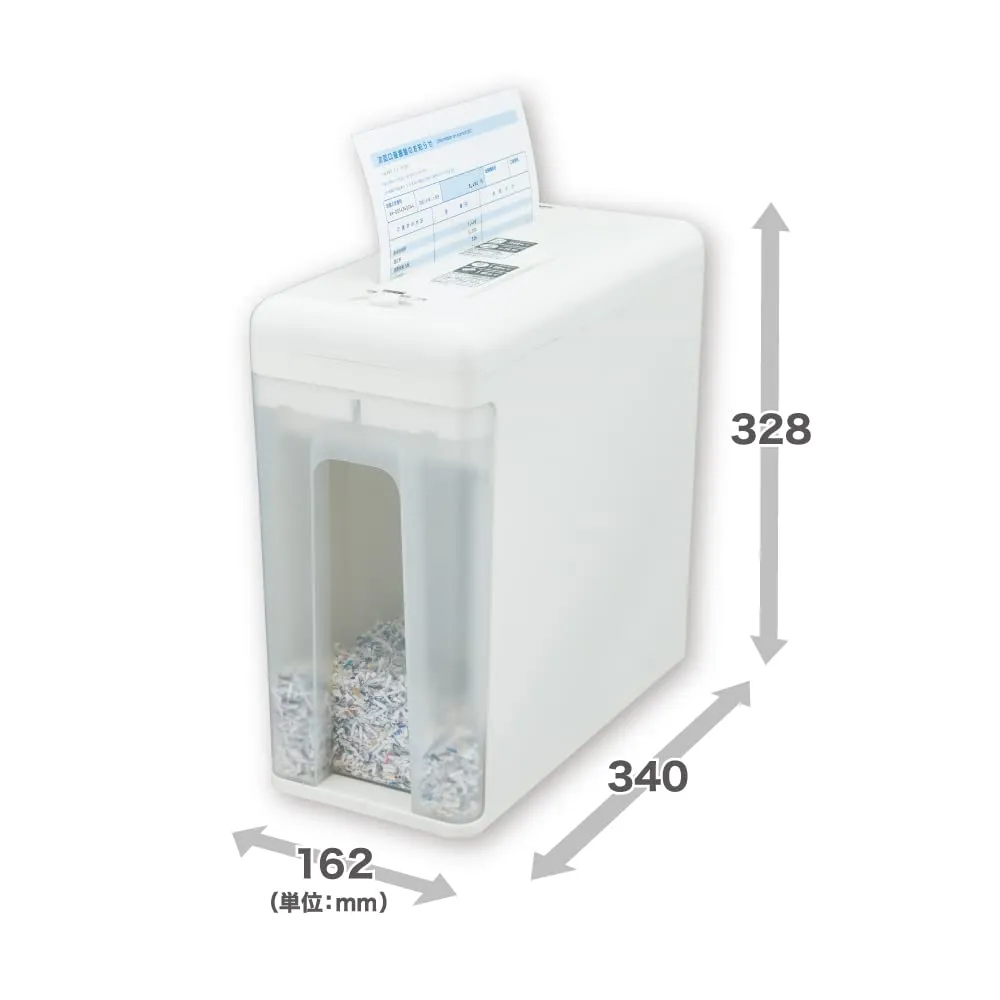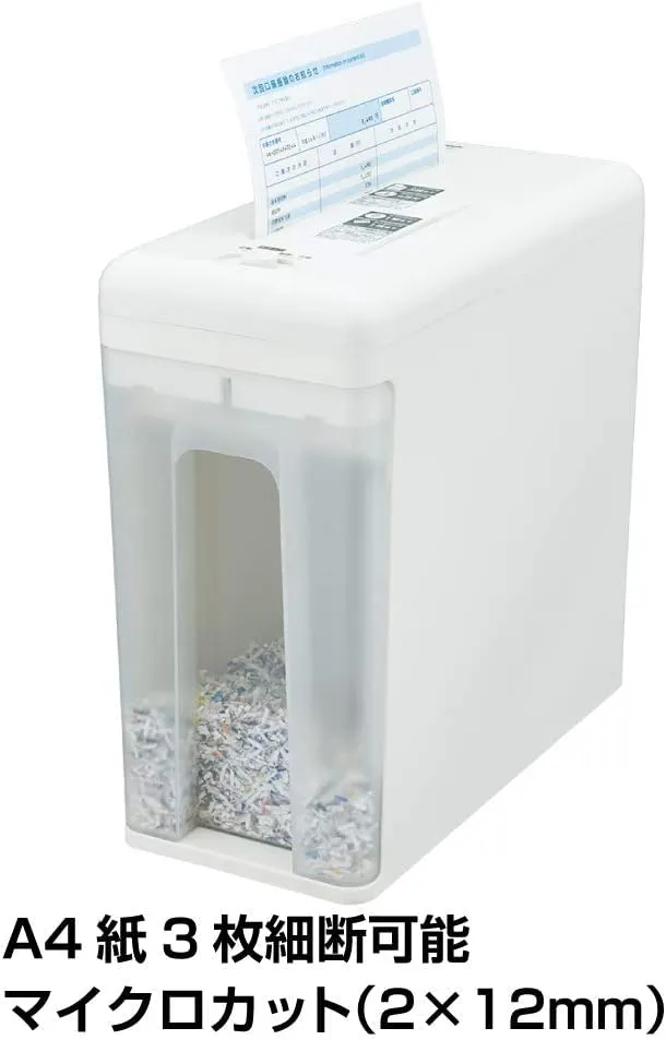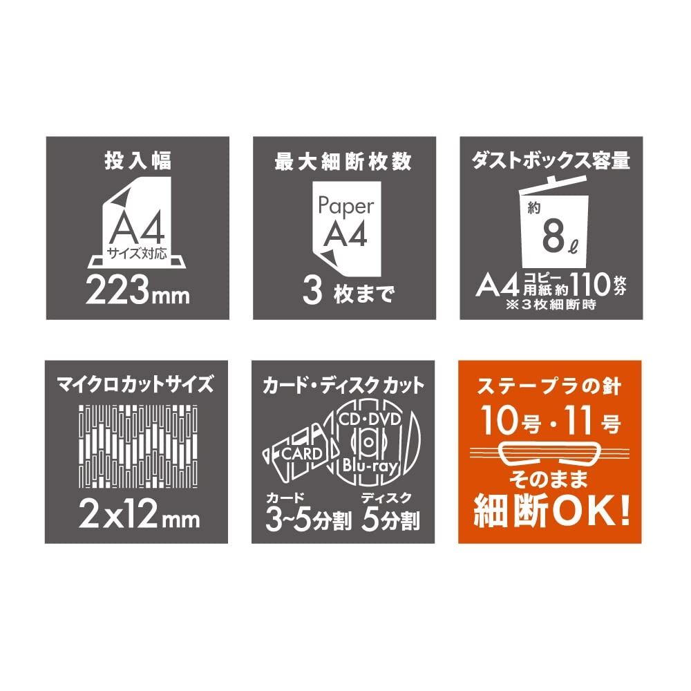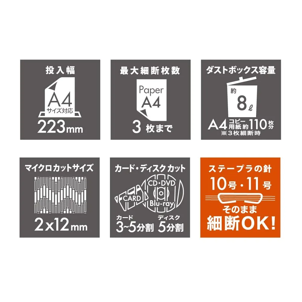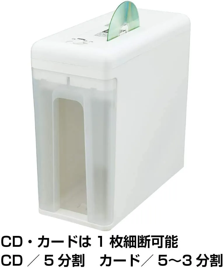 ●最大細断枚数:紙/3枚(A4上質紙64g/m2)※郵便はがき/1枚(厚み0.2mmまで)CD・カード/1枚
