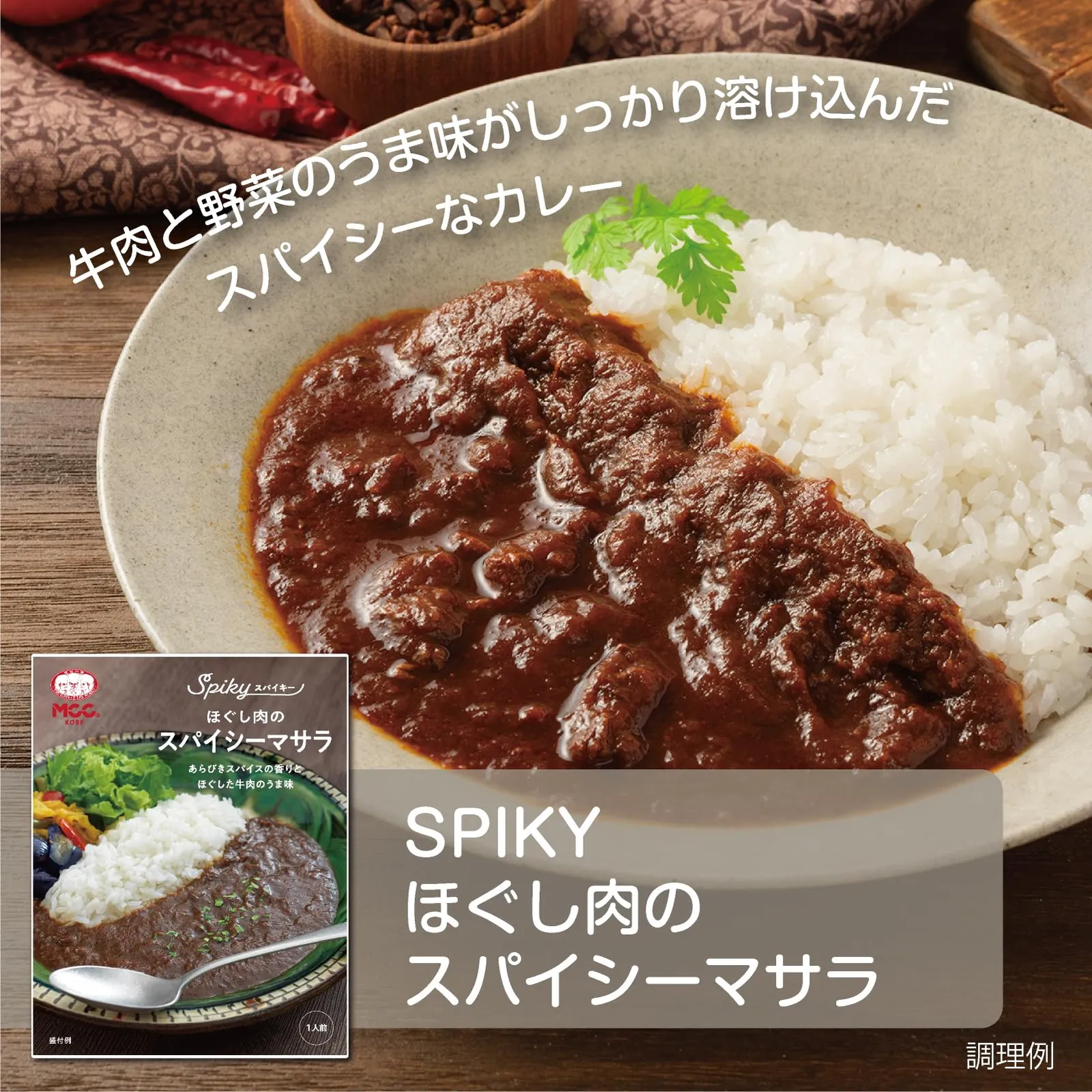 【SPIKY ほぐし肉のスパイシーマサラ】:あらびきスパイスがアクセントの牛肉と野菜のうま味が溶け込んだカレー。肉のうま味を感じられるほぐした牛肉や、甘みとうま味が凝縮された野菜・フルーツなどが溶け込んだソースに、辛さと香りが特徴のスパイスを合わせました。