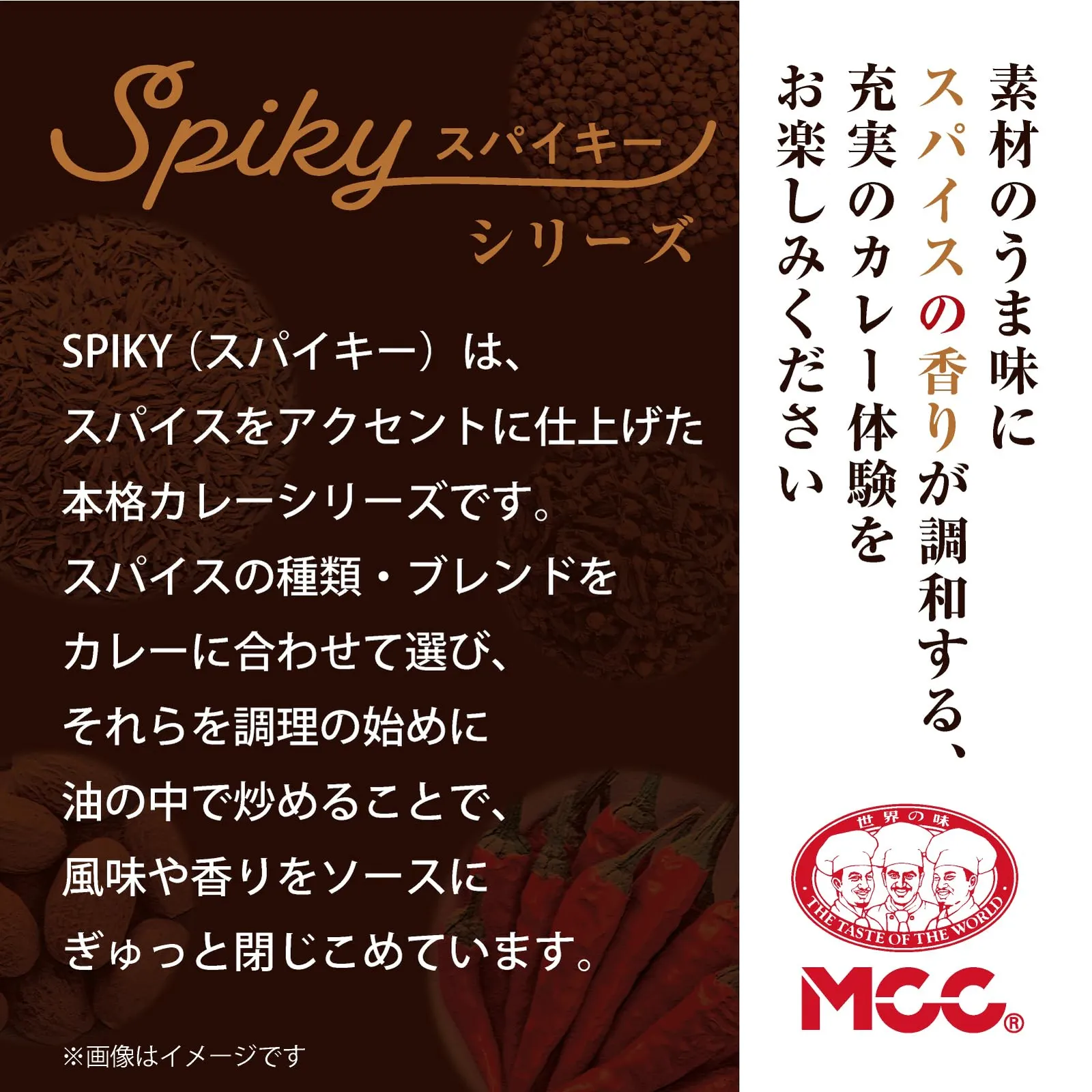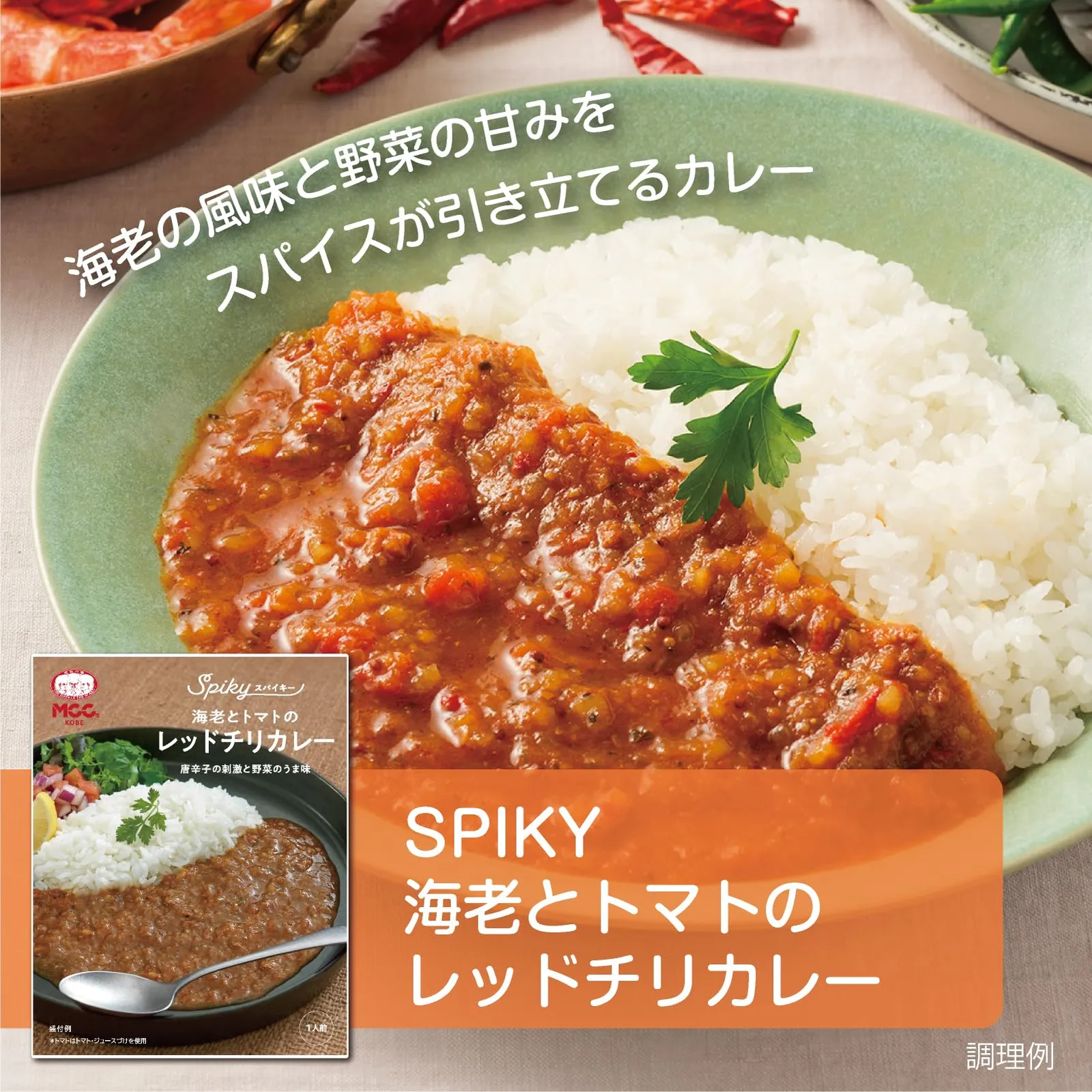 【SPIKY 海老とトマトのレッドチリカレー】:唐辛子の刺激がアクセントの海老と野菜のうま味あふれるカレー。粗くきざんだ海老の風味とトマト・じゃがいも・カリフラワーなどの野菜の甘みに合うように、独特の風味や辛さのある3種の唐辛子をはじめとしたスパイスを合わせました。 原材料・成分