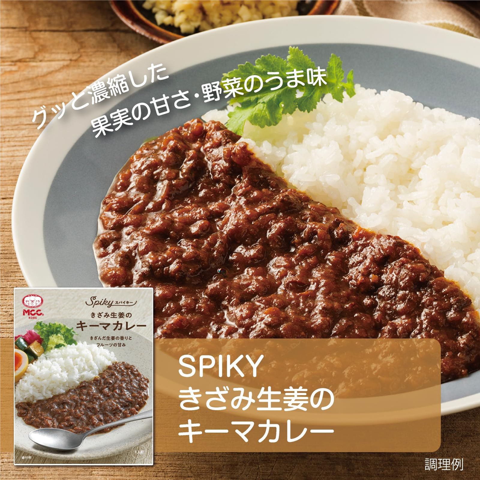 【SPIKYきざみ 生姜のキーマカレー】:素材のうま味あふれるソースを生姜の辛みと香りで引き締めたキーマカレー。豚肉のコクや、甘みとうま味が凝縮された野菜・フルーツなどに合うように、爽やかな香りが特徴のスパイスを選び、生姜の辛みと香りで仕上げました。