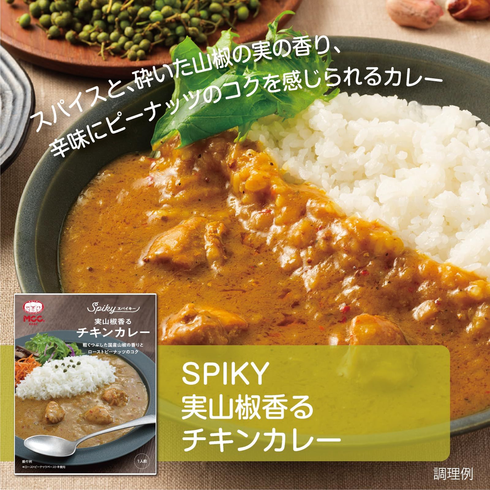 【SPIKY 実山椒香るチキンカレー】:山椒の華やかな香りとピリッとした辛みが感じられるチキンカレー。鶏の出汁感に合うよう、香り・辛みが特徴のスパイスを選び、ピーナッツペーストとバターでコクをだし、粗くつぶした山椒の実で仕上げました。