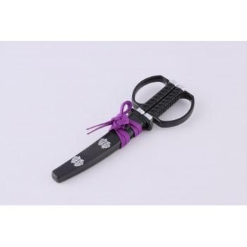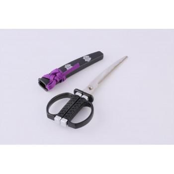伊達政宗の愛刀をモチーフとしており、鞘には伊達家の家紋」竹に雀」を入れております。関の職人の技術による抜群の切れ味に加え、安全性・携行性・に優れた鞘キャップ付きで、使用性を高めております。掛け台付きのため、ハサミとして使わない時でも部屋に飾って楽しむことができます。当社製品の特長である」R(アール)刃」を採用し、上刃と下刃の長さの違いによる「引き切り効果」を実現しております。