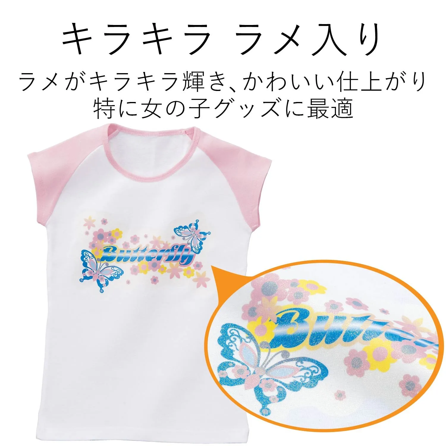 白・淡色生地用。セット内容:アイロンプリントペーパーA4サイズ(フリー)3枚、仕上紙1枚、取扱説明書。新開発のラメ入り素材採用!キラキラ輝きカワイイ仕上がりになるので、女の子向きグッズに最適です。