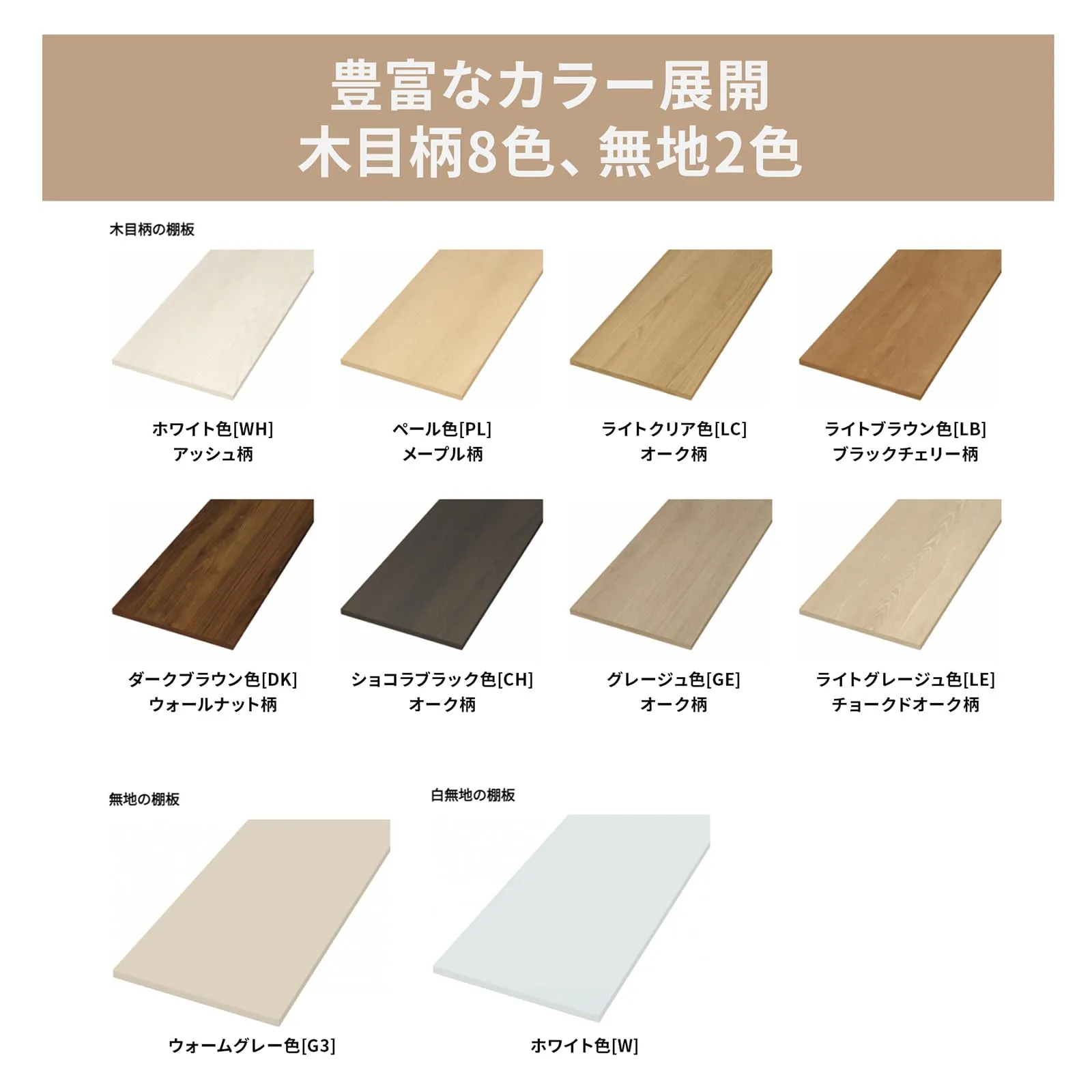 【豊富なサイズ展開】 奥行145mm 文庫本や小物・植物など装飾品 奥行250mm カゴ・タオル置きにちょうどいいサイズ 奥行300mm 絵本や雑誌・小物・靴などにも良いサイズ 奥行350mm バスタオルや洗面用品など 奥行400mm お鍋やフライパンも余裕で収納できる 奥行450mm 大きな箱などもゆとりをもって収納、たたんだ服など 奥行600mm 大きな奥行きのある棚、パネル用に縦使いの用途も