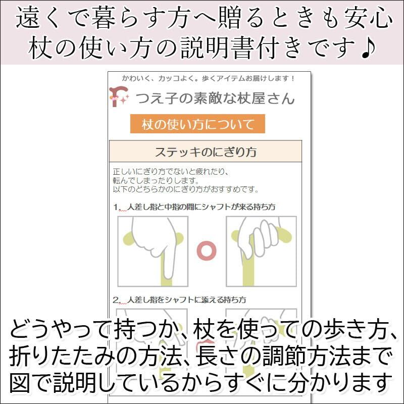 【お使いになる方の身長】:144~164cm 当店オリジナル、杖の使い方説明書付きです。 ステッキの重さ:465g(6点タイプ) グリップ(杖の手元)の素材:木製(カエデ)、シャフト(杖の棒部分)の素材:アルミ 折りたたんだ時の大きさ:29cm 最後までご確認頂き誠にありがとうございました。 上記をご確認頂き、ご購入いただけましたら幸いです。 何かご不明な点がございましたらお気軽にメッセージからお問い合わせ下さい。 配送について、土日祝は配送業務がお休みとなります。 ご了承ください。 宜しくお願い致します。