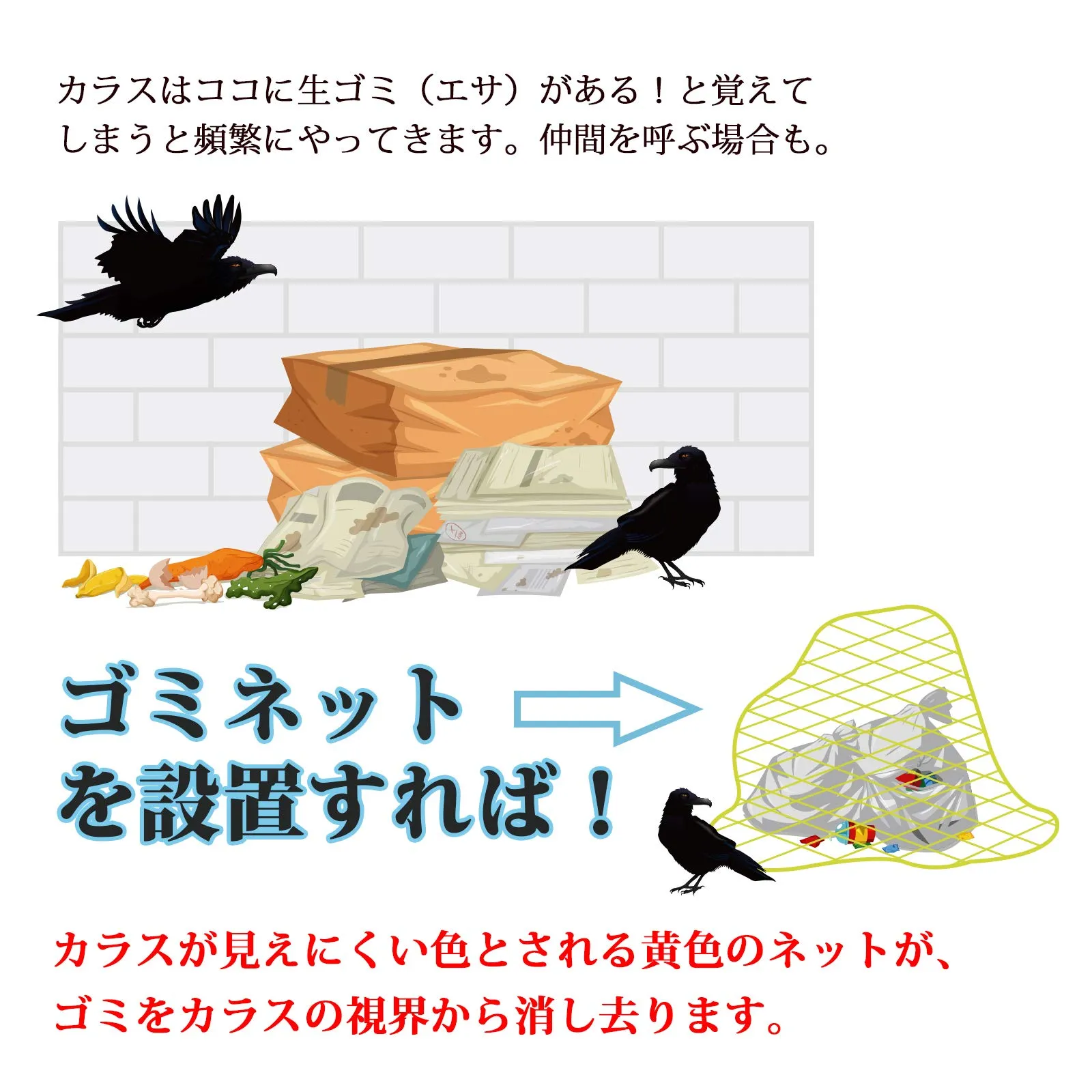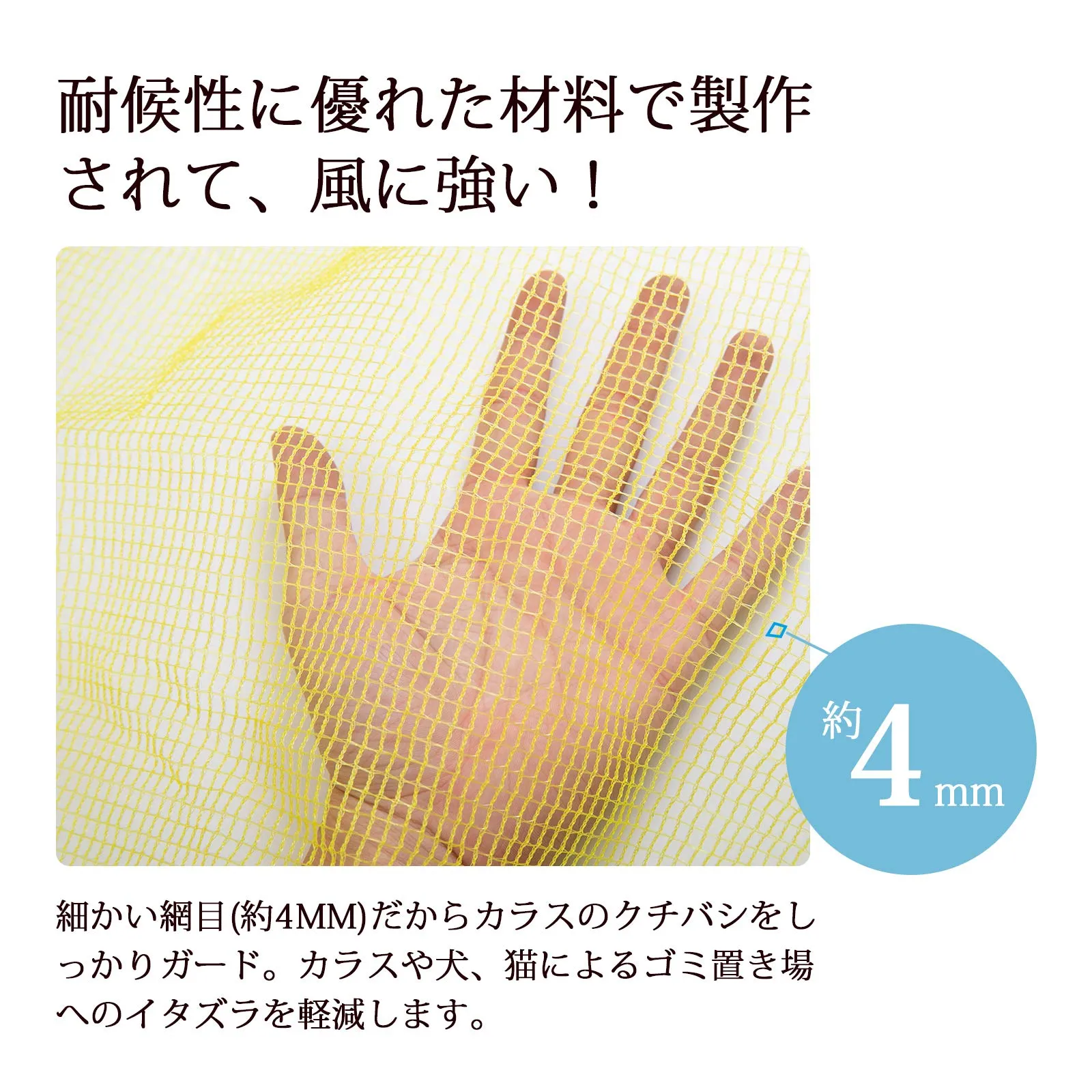 【効果抜群】細かい網目(約4mm)だからカラスのクチバシをしっかりガード、足に絡まりやすい(下からゴミ袋が見えないように使うと更に効果的です) 最後までご確認頂き誠にありがとうございました。 上記をご確認頂き、ご購入いただけましたら幸いです。 何かご不明な点がございましたらお気軽にメッセージからお問い合わせ下さい。 配送について、土日祝は配送業務がお休みとなります。 ご了承ください。 宜しくお願い致します。