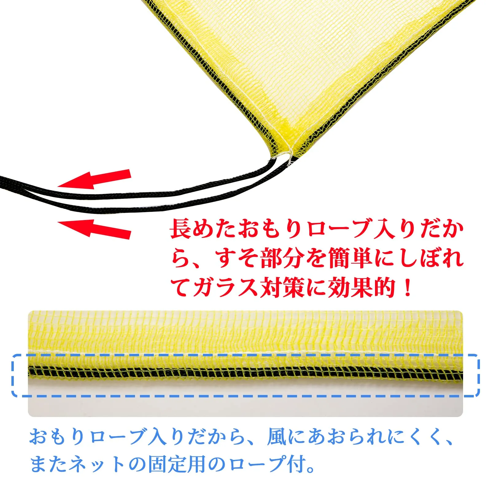 【おもり入りタイプ】 ネット周囲におもりロープ入り。ロープが長いのでスソ部分を軽くしぼったりもできて作業性がよいです。