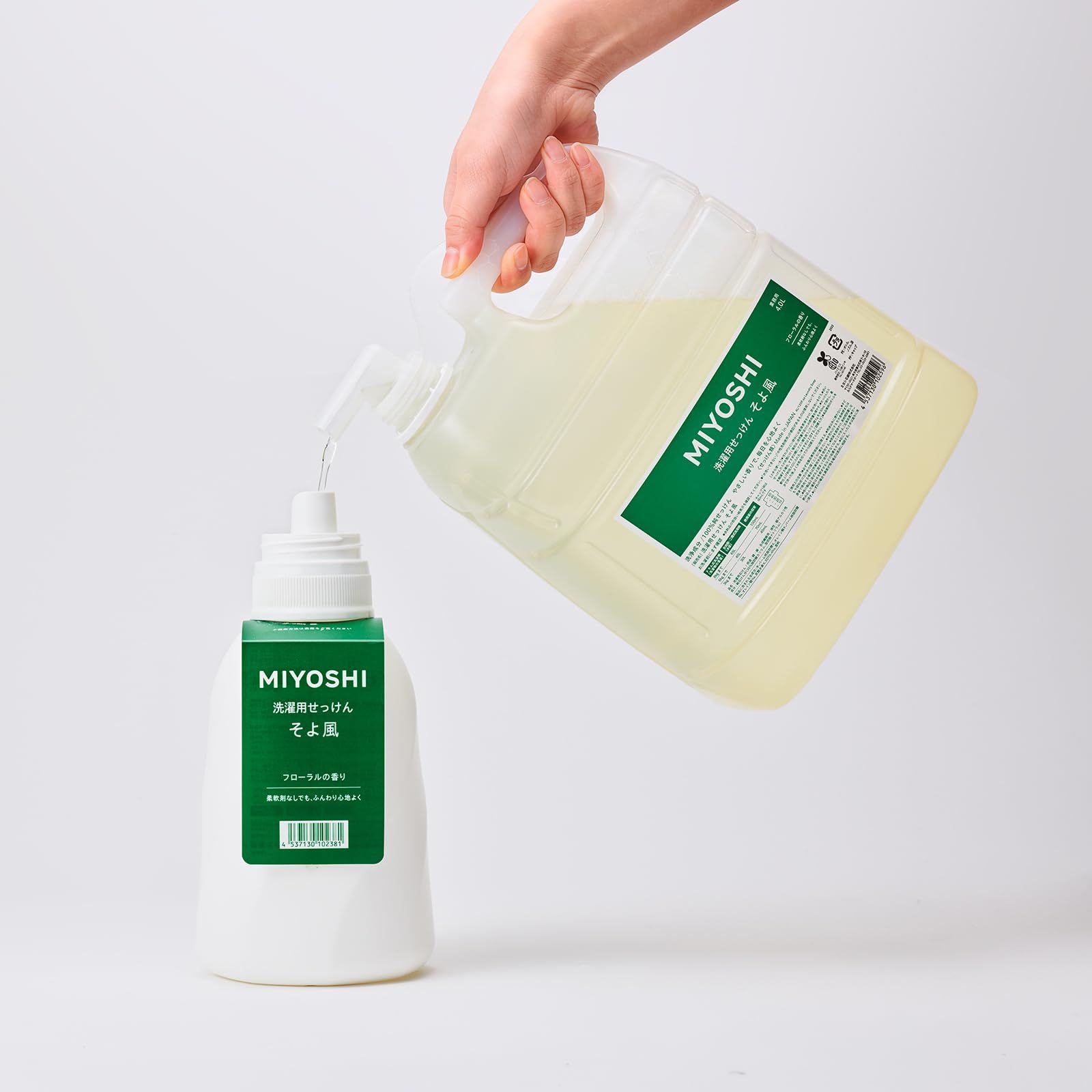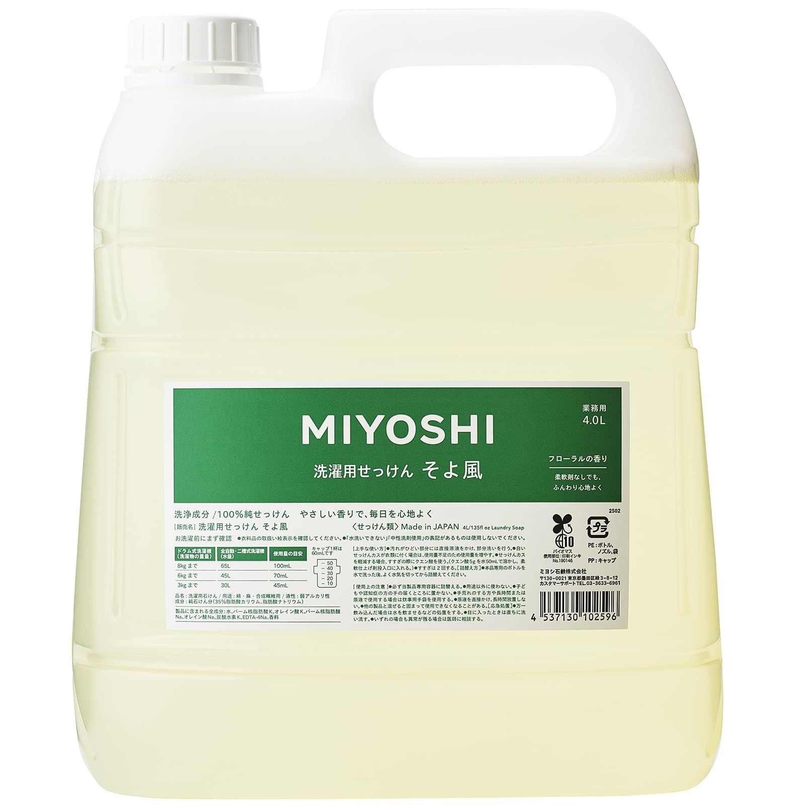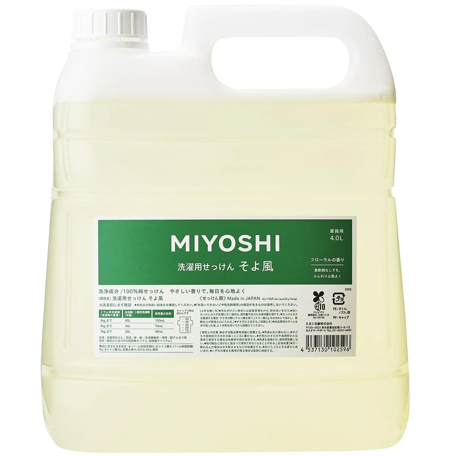 せっけん濃度を高め、洗浄力を強化した液体せっけん。ふんわりと仕上がり、香りを楽しみたい方へおすすめ。業務用の大容量4L。