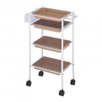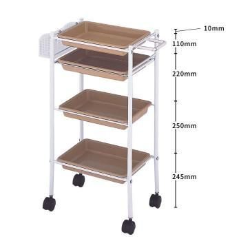 ドライヤーホルダー兼用取手、メッシュラック付きのトレー式天板ワゴンです。