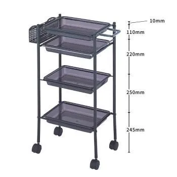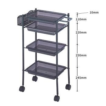 ドライヤーホルダー兼用取手、メッシュラック付きのトレー式天板ワゴンです。