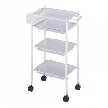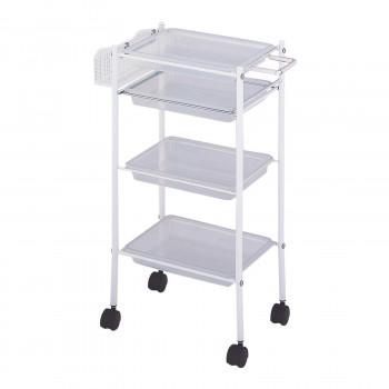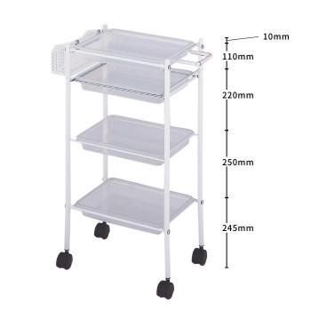 ドライヤーホルダー兼用取手、メッシュラック付きのトレー式天板ワゴンです。