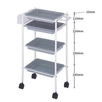 ドライヤーホルダー兼用取手、メッシュラック付きのトレー式天板ワゴンです。