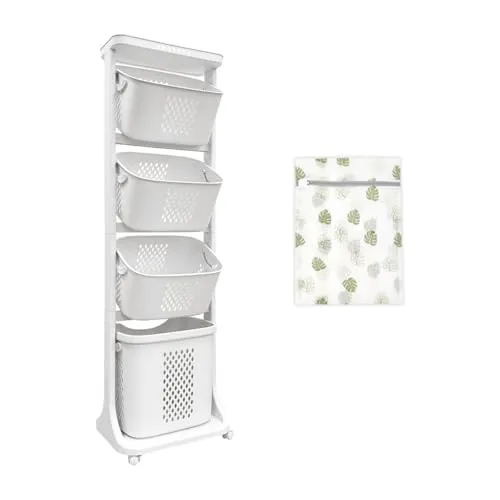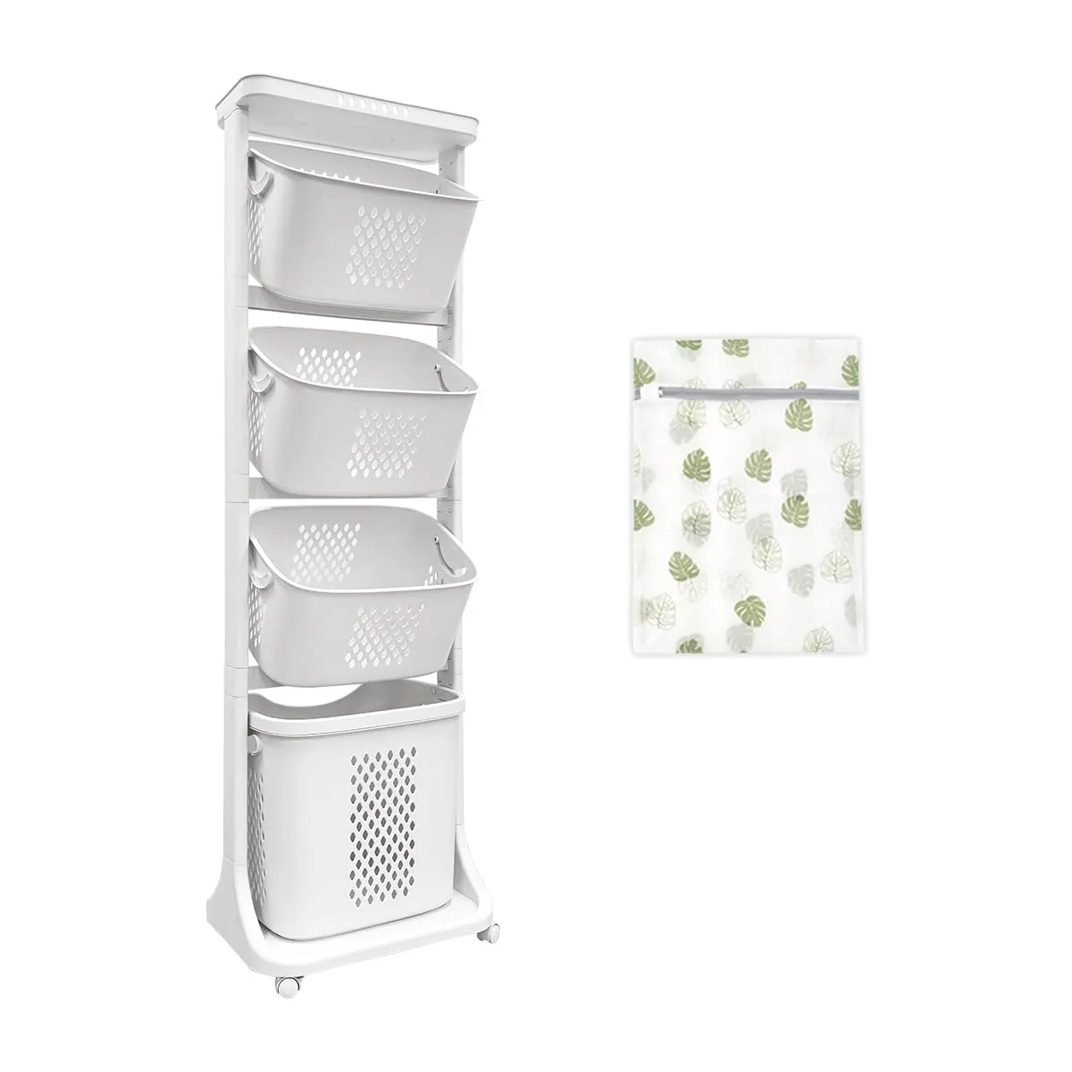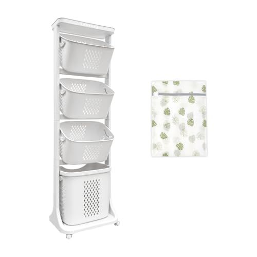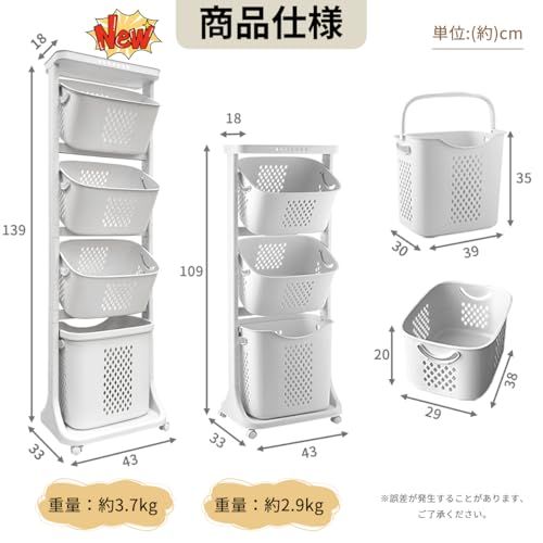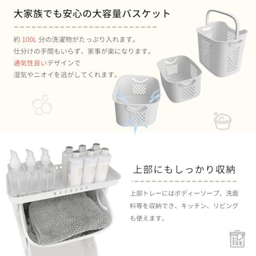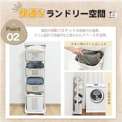 【RAKU】ランドリーバスケット スクエア 洗濯かご 脱衣所 洗濯物 収納 キャスター付き おしゃれ シンプル スリム 北欧 大容量 インテリア雑貨 洗える ホワイト (4段)/