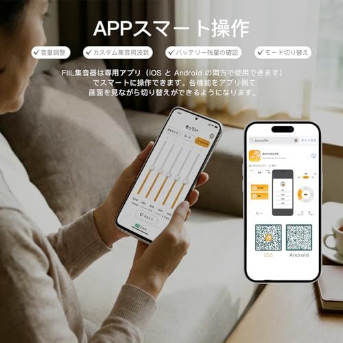 【スマホアプリ操作機能】スマートフォン専用アプリからの操作に対応し、Android・iOS の両システムに対応しているため、多くの機種で安心してご利用いただけます。アプリは日本語・中国語・英語・韓国語の4言語に対応しており、スムーズに操作できます。どなたでも画面の指示に従って簡単に各種設定を行うことができ、高齢の方でも迷うことなく操作することが可能です。アプリからは音量・モード・周波数を手動で細かく調整でき、使用環境や好みに合わせて、機器を自分に最適な状態に仕上げることができます。