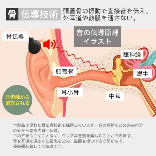 【革新的な骨伝導技術】本集音器は革新的な骨伝導技術を搭載し、従来の音響機器とは違う、新しい音の体験をお届けします。骨伝導により音波を側頭骨を介して聴覚神経に直接伝達するため、外耳道を塞ぐ必要がなく、長時間ご使用いただいても耳の疲れや閉塞感がなく、快適な装着感を実現します。