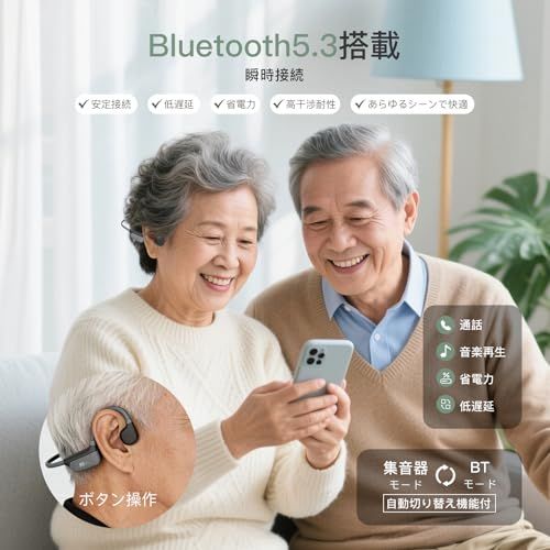 【BT 機能搭載】最新のBT5.3に対応し、スマートフォンや各種デバイスとの接続が安定かつ簡単です。音楽の再生・一時停止や、電話の応答・拒否などの操作も、本体でワンタッチ操作ができ、デバイスを取り外す必要がありません。電源をダブルクリックするだけで、集音器機能と BT 機能をシームレスに切り替えられるため、シーンに合わせて瞬時に使い分けができ、日常のさまざまな場面で快適にご利用いただけます。